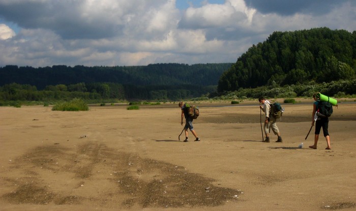 Прямо перед нами посреди реки крупный остров, вполовину заросший высоким сосняком со стройными красными стволами, вполовину растянувшийся длинной песчаной косой. Со временем похода мы отлично угадали - в разгар лета рукав реки между нашим правым берегом и островом обмелел, обнажив огромные площади песка! Это и есть Поющие пески, к которым мы шли так мокро, так мозольно, так превозмогая бездорожное пространство своими телами, прямо говоря не очень-то тренированными и не привыкшими к такой походной жизни.