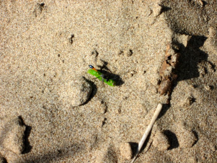 Бросаемся к нему - и на бегу понимаем, что бежать очень странно! Не те тактильные ощущения от песка, по другому на него ложится шаг, шуршит он иначе... Шуршит! Он шуршит не как обычный пляжный песок! Он не шуршит, он скрипит, скрежещет, свистит! Это достаточно сложно описать, потому что звук непривычный.