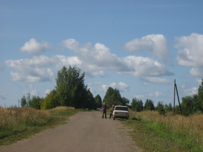 Купив концентрированной радости туриста (вода, шоколадка, сардельки), начали искать способы выбраться из деревни. Автобус нас не устраивал - ушёл пять минут назад, ходит раз в две недели. Договорились с местным жителем с ветхой копейкой, что он нас за небольшой рубль вывезет до трассы Советск-Лебяжье. Едем!