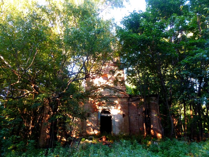 И живописные руины храма. Причём, что интересно, сюда изредка кто-то забредает - в пустой разрушающейся церкви висит несколько новых иконок.