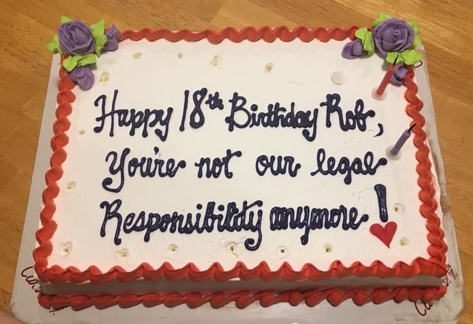 3719 YaZoV 7 лет назад Поздравление "Роб, поздравляем тебя с 18ти летием. Наша юридическая ответственность за тебя закончилась." Торт Поздравление День рождения Перевод