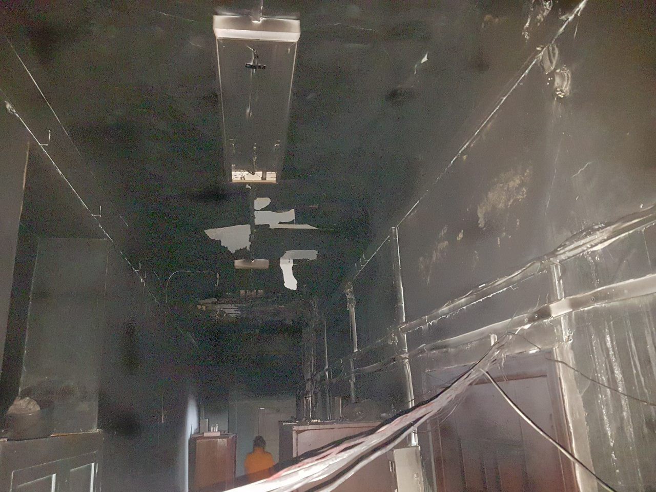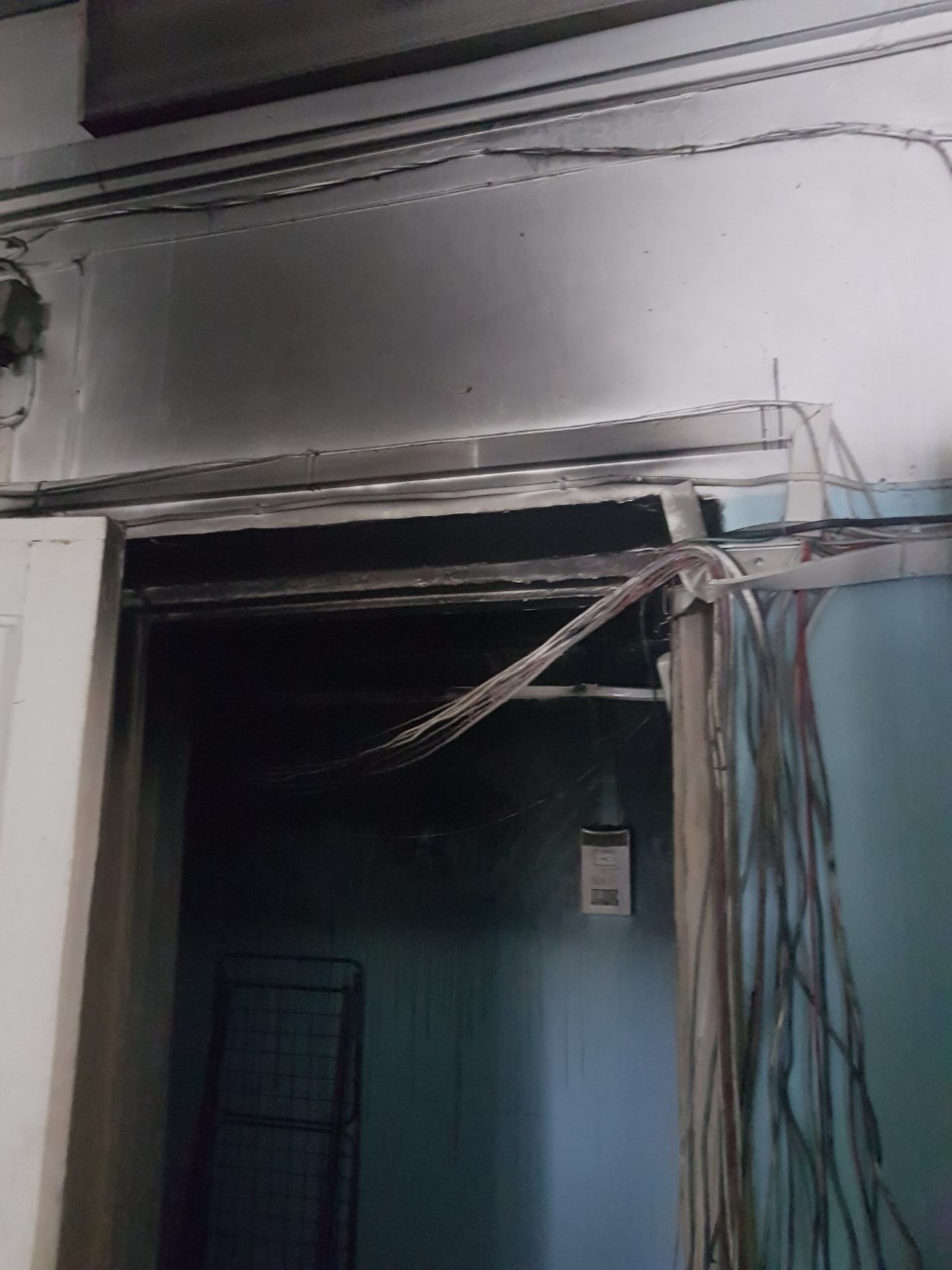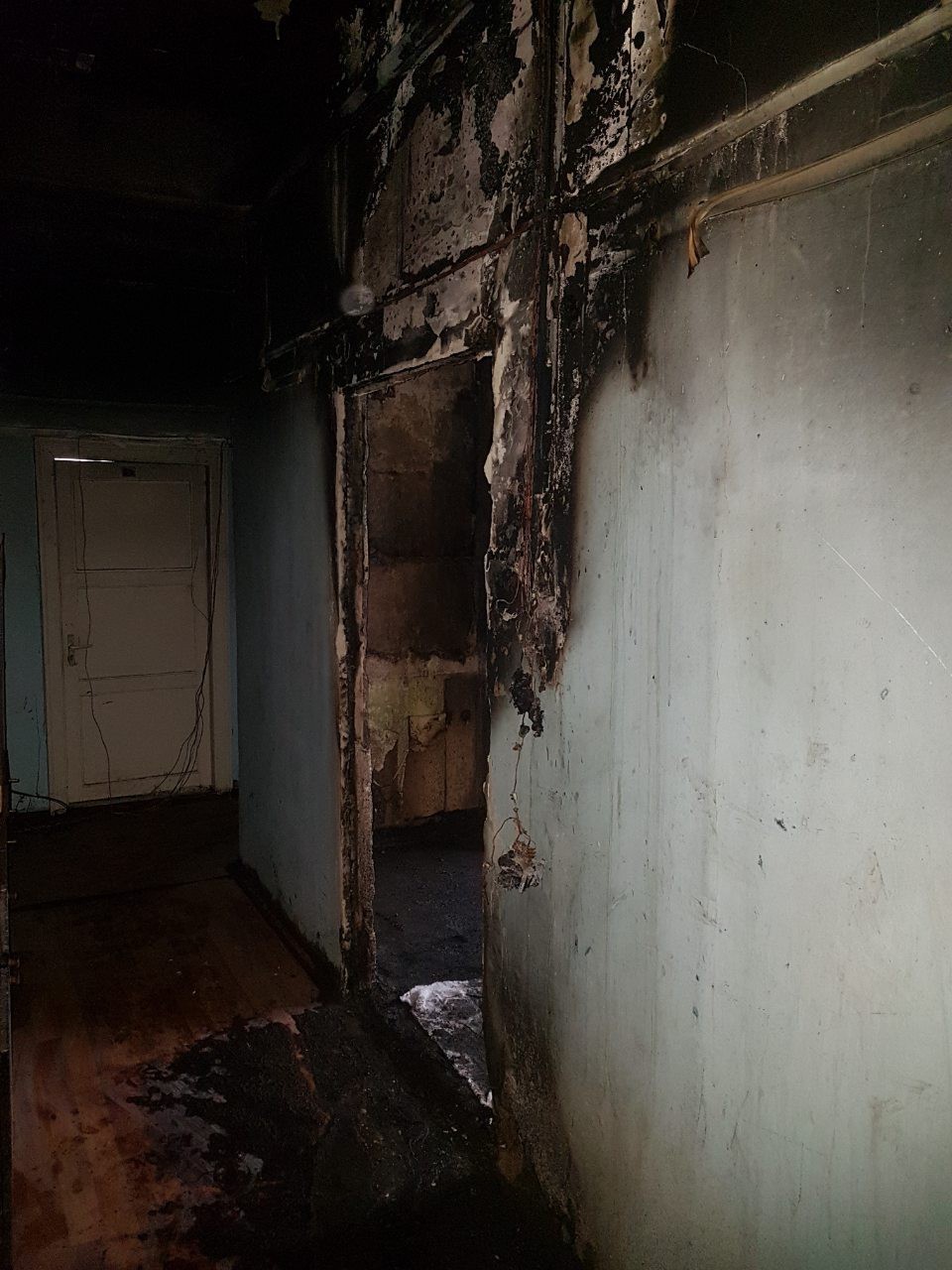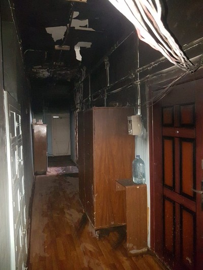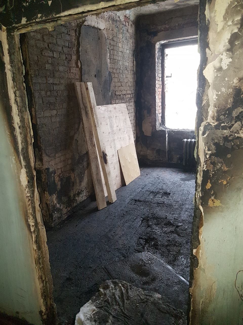 4. От огня пострадала только эта комната и соседнее окно (коридорное). Т.к. огонь бушевал за закрытой дверью, ни общий коридор, ни комнаты соседей от огня не пострадали. Однако, из-за пожара прорвало какую-то трубу. Тушили водой, залили весь коридор, лестницу и т.д.