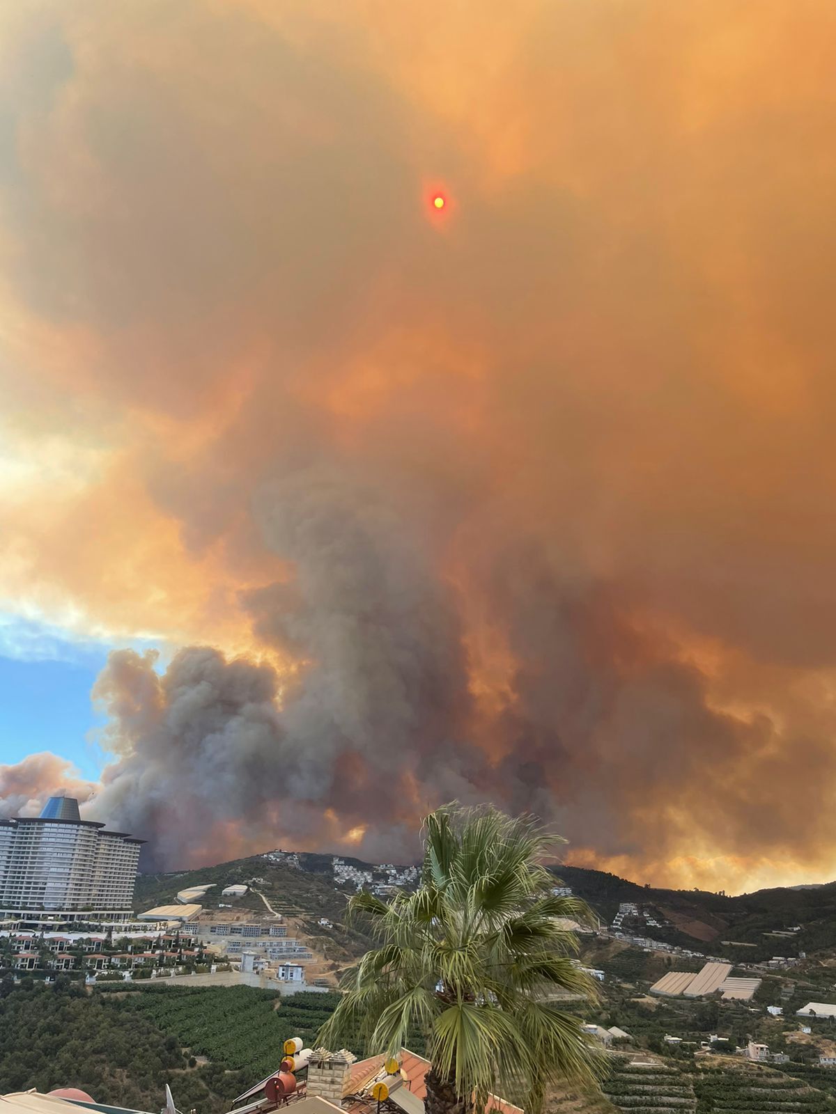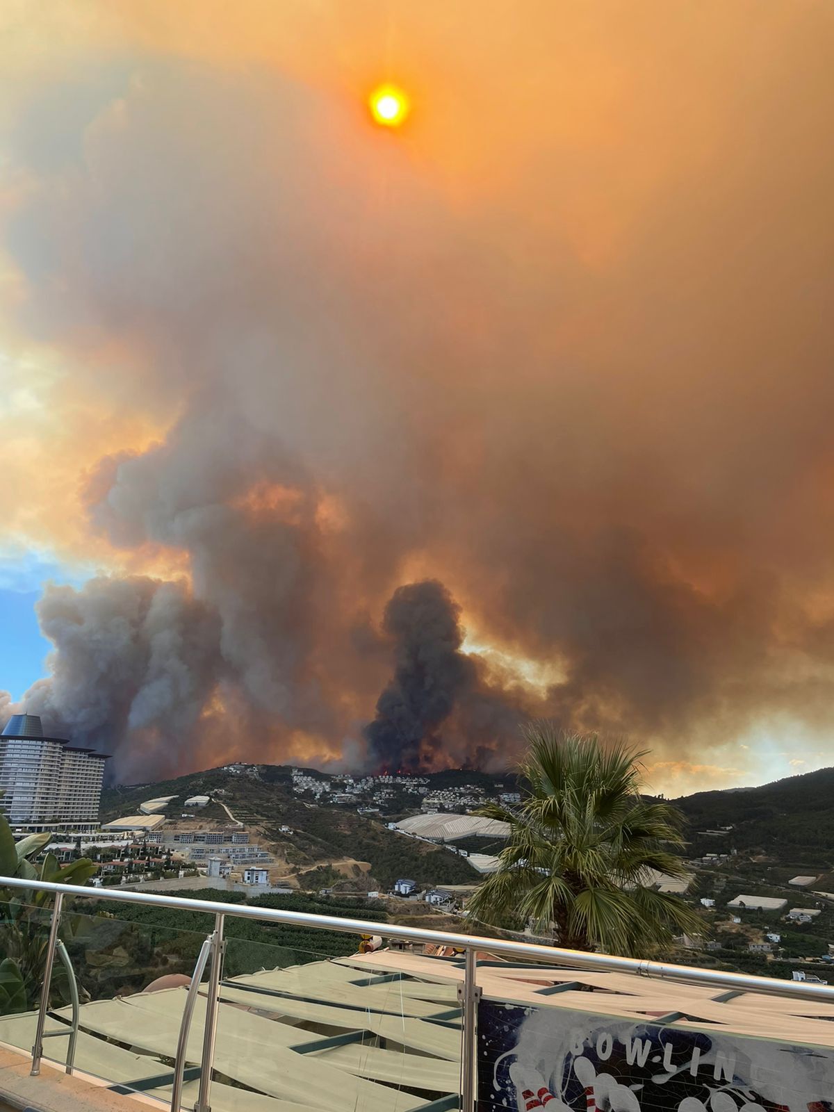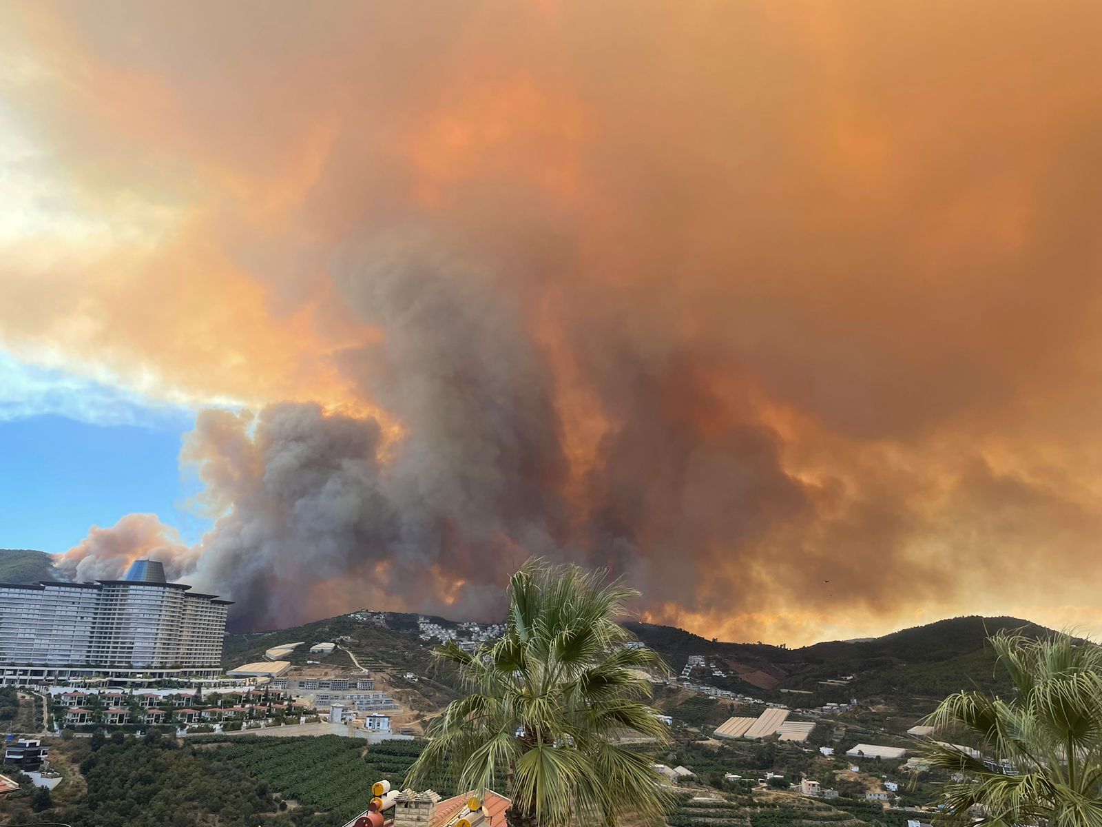 Район Анталии. Про эвакуацию пока ничего не говорят. Вертушки летают с самого утра до моря, хватают воды и летят тушить. Но что-то не очень у них получается. Все напряжены очень уже. Надеемся на лучшее.