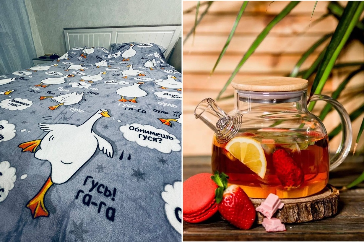 Мемный плед с гусём (а почему нет?), заварник для чая (теперь чаеман) и две кружки с вакуумом, хорошо держат тепло и не нагреваются.