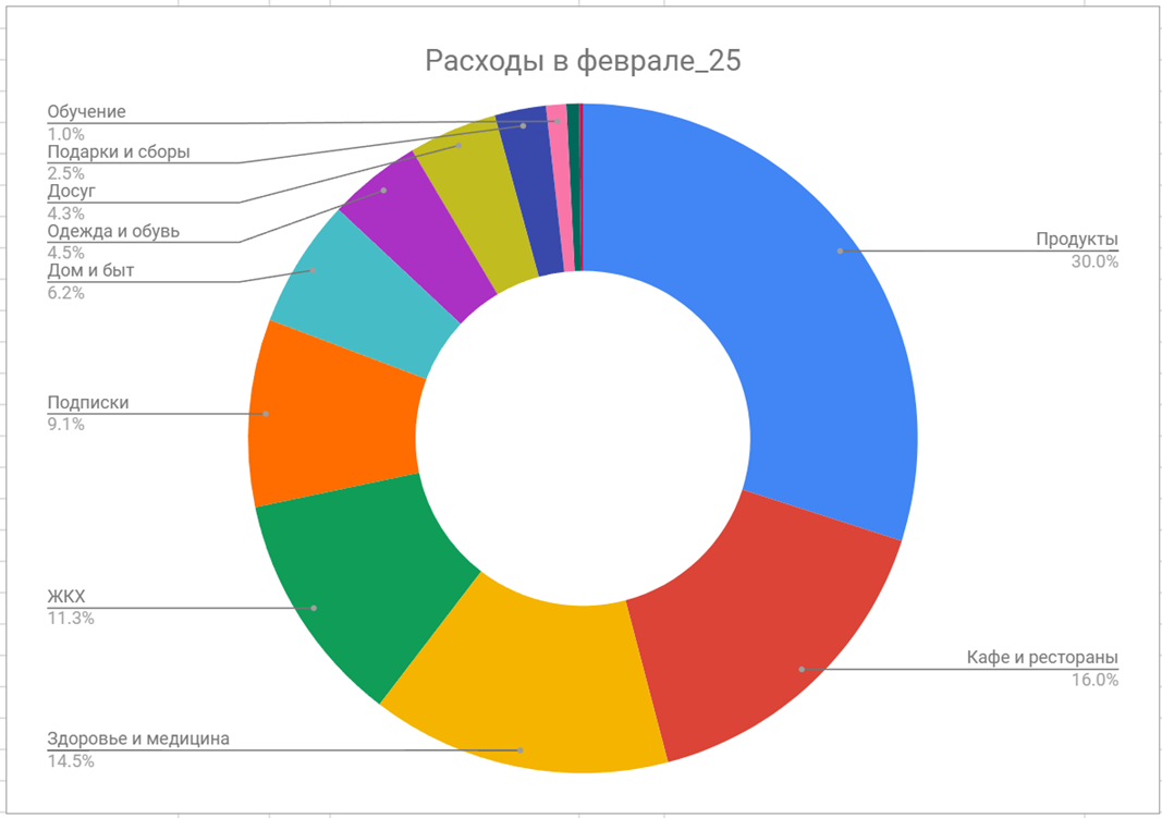 ТОП-1 категория расходов, почти каждый месяц. Отдельно публиковал рацион питания на месяц, т.к. народ не верил как можно так мало тратить. В целом питаюсь "правильно": индейка, картошка, сыр, шампионы, но бывает сладостями заедаю стресс, ничего не могу с этим поделать.