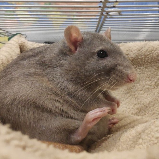 Я решила его забрать к себе, ему было уже 2 годика, с аллергией от опилок в виде ранок на шее. Звали его ранее Суетолог, но у нас он стал Дед Борис. Пробыл у нас неделю и отправился гулять по радуге так и не познакомившись с другими крысюками :)