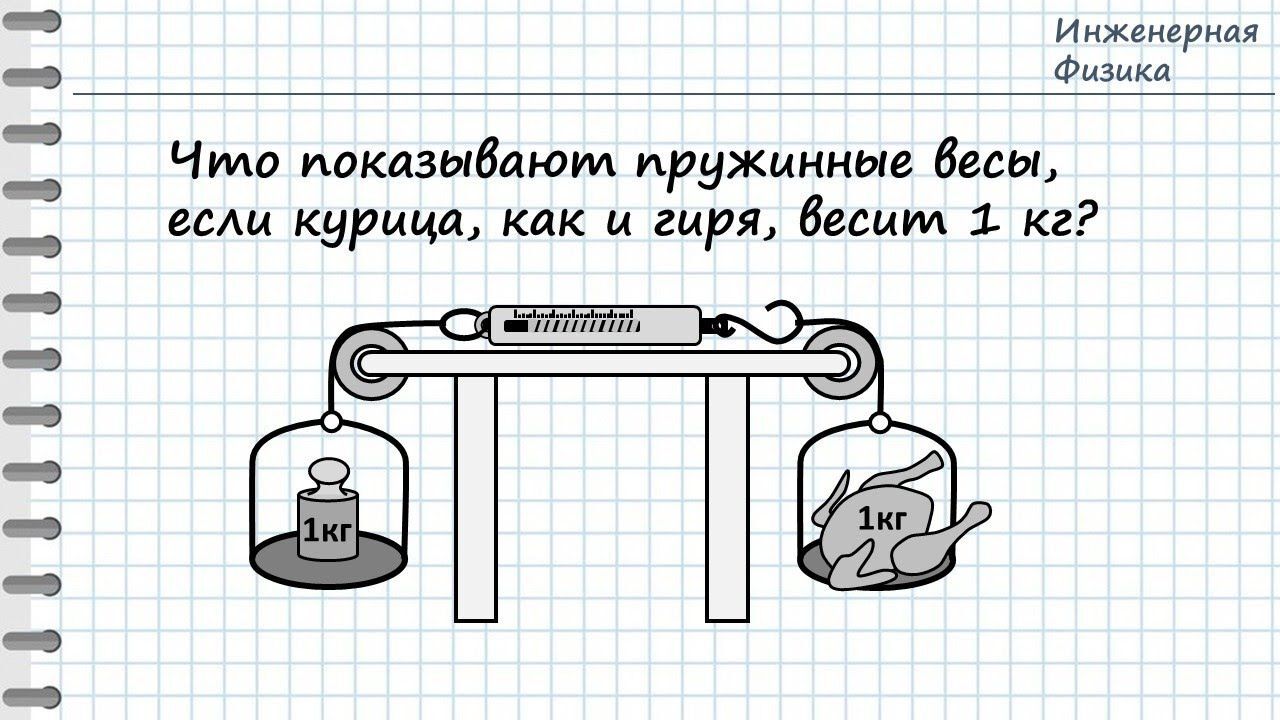 Ответ: конечно же 1 кг. Гиря выступает в роли простого противодействия курице, чтобы та не перевесила всю систему. Если вы возьмёте весы в руку, то будете также их тянуть вверх с усилием в 1 кг (сколько это, 10 Ньютонов?)