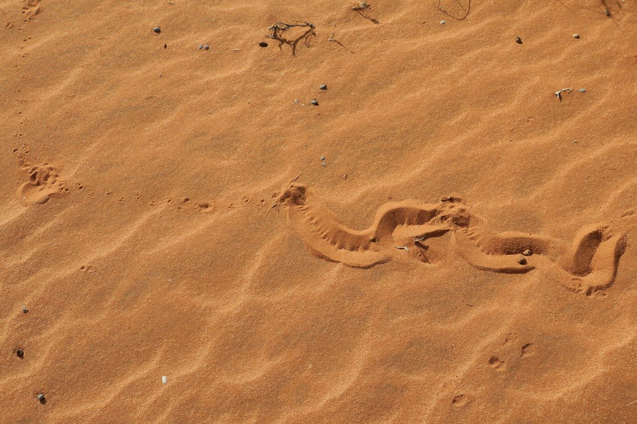 Ответ: Извилистая форма напоминает отпечаток змеиного тела, но в какой-то момент «змею» сменяют отпечатки крохотных лапок, деловито уходящих влево и вверх. Это следы пустынного златокрота Eremitalpa granti.