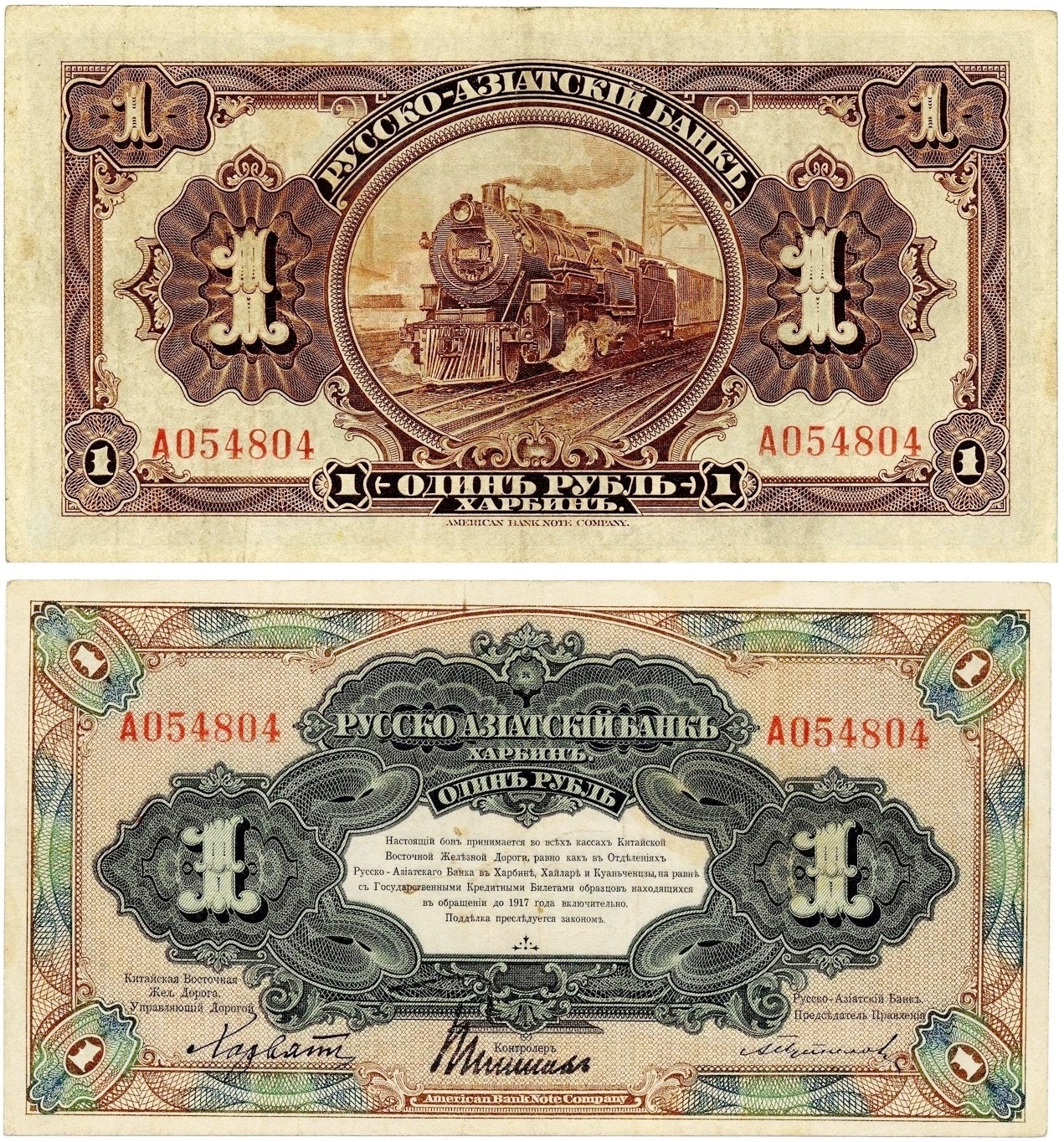 "Харбинский рубль" Русско-Азиатского банка. На оборотной стороне купюры изображен паровоз Китайско-Восточной ж/д. 1917-1920: