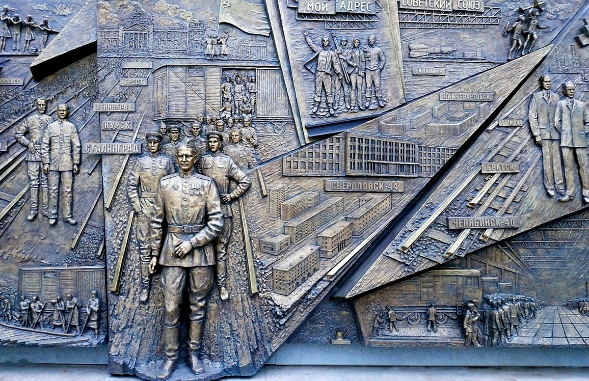 Фрагменты памятника-барельефа "Железные дороги в истории России" в сквере у здания Управления Свердловской ж/д, фото 20.09.2018, авторство не нашел:
