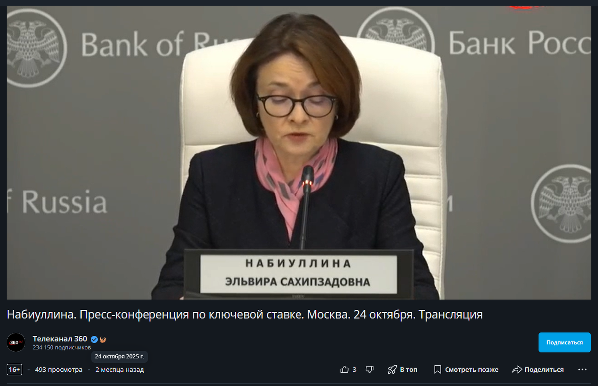 На оригинальных кадрах от 24 октября председатель ЦБ РФ говорит об экономической ситуации в рамках пресс-конференции по ключевой ставке.