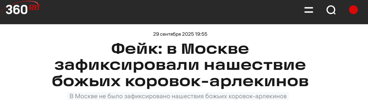 В Сети пишут, что Москву якобы наводнили божьи коровки-арлекины — опасный вид насекомых, которые при контакте с человеком могут вызвать сильную аллергию или даже признаки отравления.