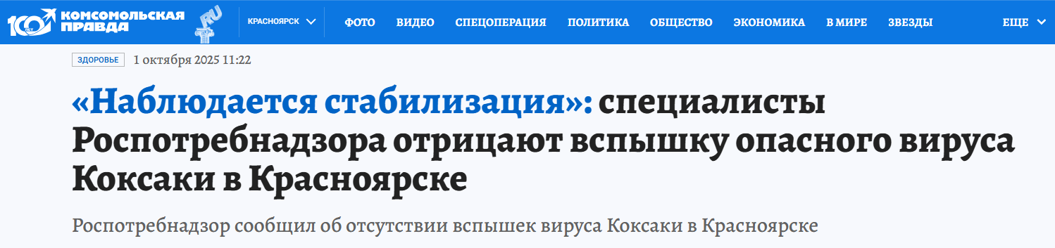 Специалисты Управления Роспотребнадзора по Красноярскому краю сообщили, что информация о вспышке вируса некорректна. Специалисты ведомства пояснили, что в 2025 году рост заболеваемости энтеровирусными инфекциями наблюдался с конца мая, а пик пришелся на август. Сейчас же происходит стабилизация ситуации, благодаря проводимым противоэпидемическим мерам.