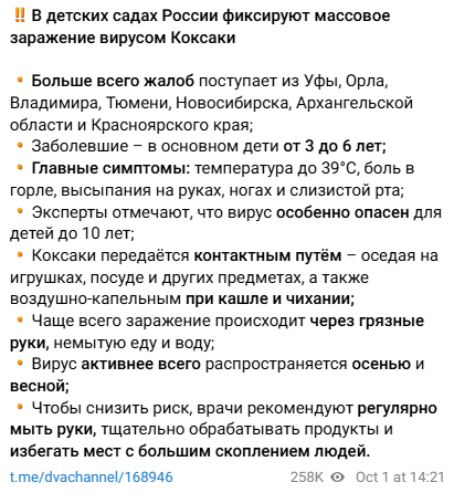 В соцсетях сообщают о массовом заражении детей дошкольного и младшего школьного возраста вирусом Коксаки по всей России. Утверждается, что случаи фиксируются в Уфе, Орле, Владимире, Тюмени, Новосибирске, Архангельской области и Красноярском крае.