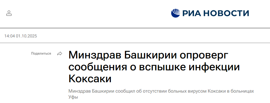 Так, Минздрав Башкирии опроверг вспышку инфекции Коксаки в столице региона: «Никакой вспышки в Уфе нет. За последнюю неделю обращений с Коксаки в инфекционную больницу не было».
