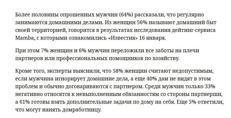 Российским мужчинам якобы грозит новая финансовая обязанность. Речь идет о выплатах женам за выполнение домашних дел, которые будут закреплены законодательно, пишут в СМИ и соцсетях.