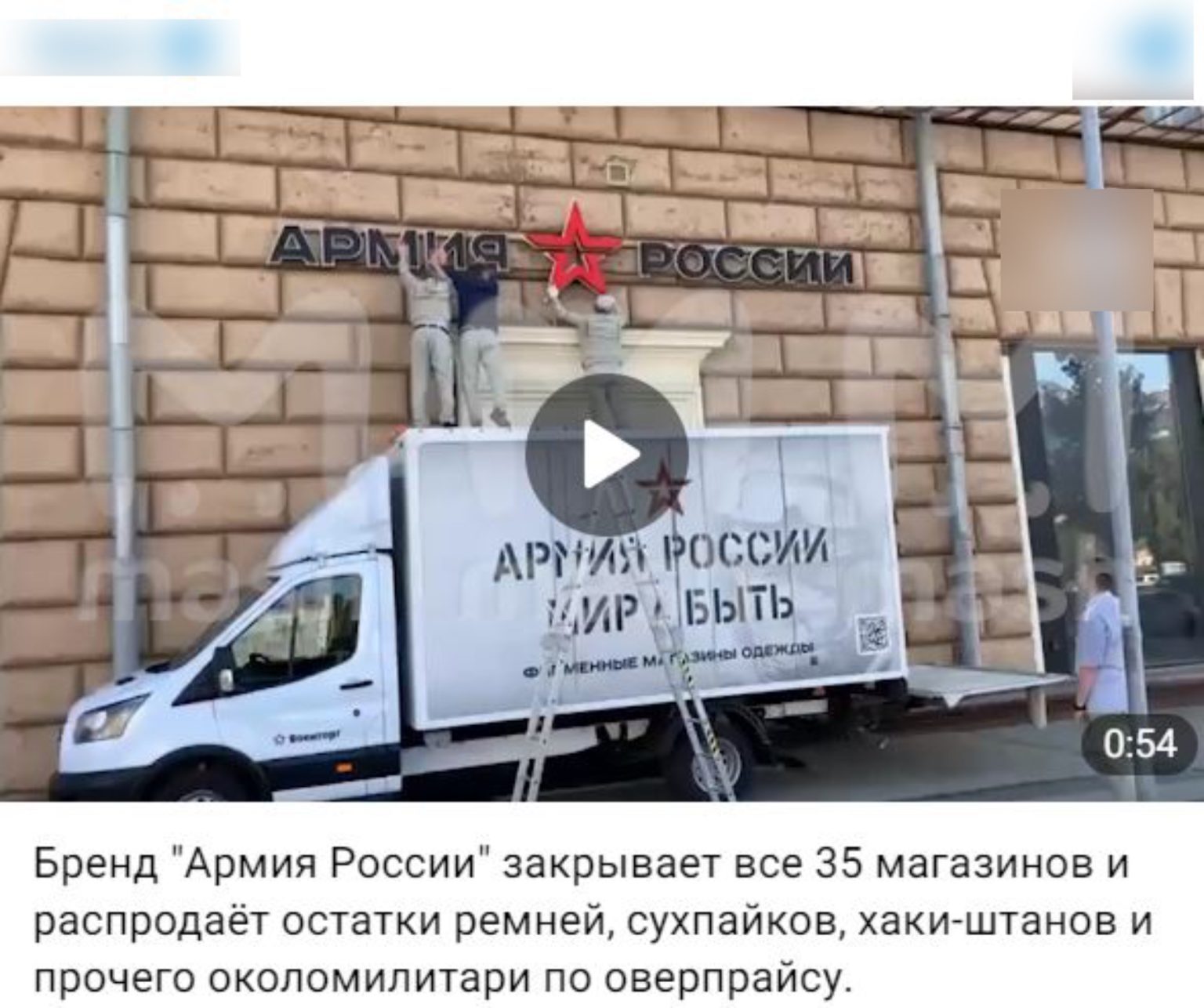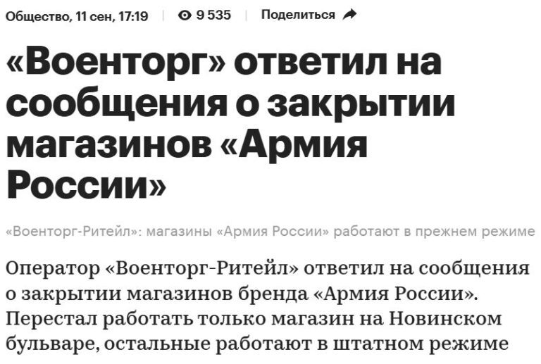 Это нет так. Магазины «Армия России» работают в прежнем режиме. Перестал работать только один магазин — на Новинском бульваре в Москве, который и был указан в фейковой публикации.