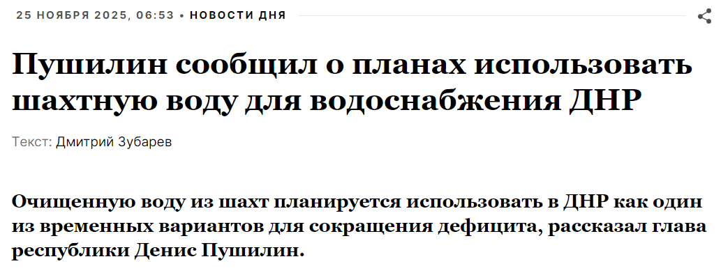 При этом планы использовать в ДНР воду из шахт действительно обсуждались, но как один из временных вариантов для сокращения дефицита, сообщил глава республики Денис Пушилин: «Был проведен полный анализ подземных источников: где возможно, где невозможно задействовать. <…> Если есть возможность за вменяемые деньги очищать эту воду, конечно, нужно эту возможность использовать».