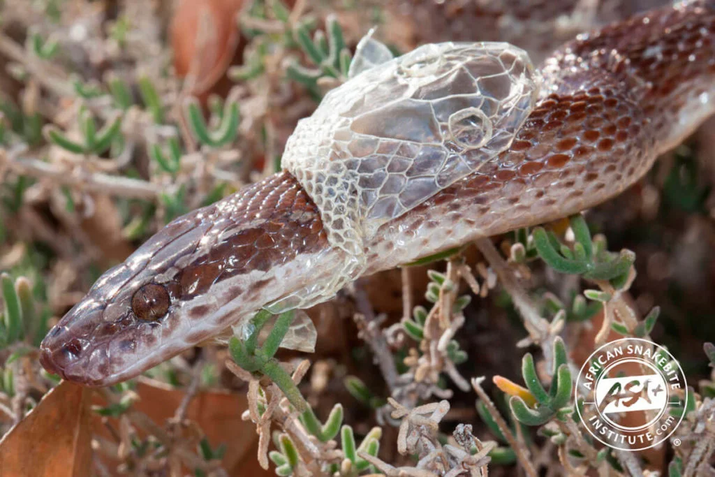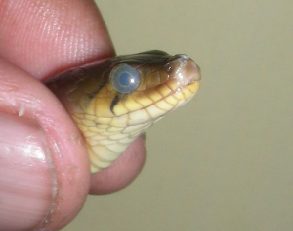 Начало линьки у коричневой домашней змеи. На уже отслоившейся коже виден глазной колпачок. Источник