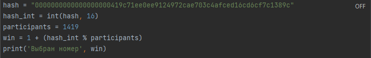После этого смотрим номер участника в списке, ищу его на Пикабу, проверяю что он выполнил условия, и пытаемся с ним связаться. Если счастливчик не выполнил условия, или не связался с администраторами, то берем следующий блок, который сгенерируется после уже взятого, и вычисляем нового счастливчика.