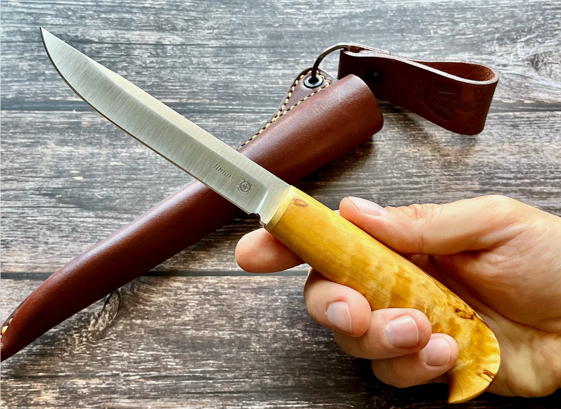 На клинке Ilmari воткнули 95Х18, проверенная чуть ли не питекантропами сталь. Ничего особенного, из плюсов только то, что неплохо заточку держит и лютое содержание хрома, а значит, не ржавеет совсем. Обух в 3, 5 мм, но к кончику сведен чуть ли не в иглу, поэтому, нож вполне можно использовать, как бандитский, если с головой не дружите, но важно помнить, что столь деликатный кончик обломится от любой солидной поперечной нагрузки. Если серьезно, то ковырять можно все, что угодно, но осторожно. Спуски с середины и есть микроподводы, что выводит нож из канонов и вводит в пантеон просто отличных ножей. По опыту: приготовил огромный обед, резал ножом на доске уйму всего в течение часа. Появился микрозамин в том месте, где нож барабанил по доске. Убрал одним движением мусата и двумя движениями на ремне вернул ножу первозданность.