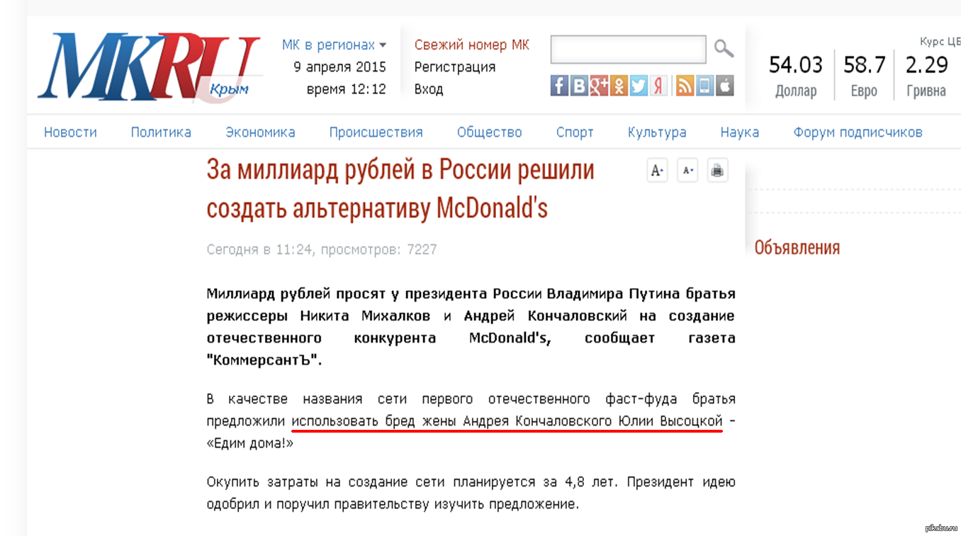 Pontschik Правильная опечатка в МК 10 лет назад в новости об идее Михалкова и Кончаловского об открытии русского МакДака Московский комсомолец Смешная опечатка Опечатка Никита Михалков Макдоналдс