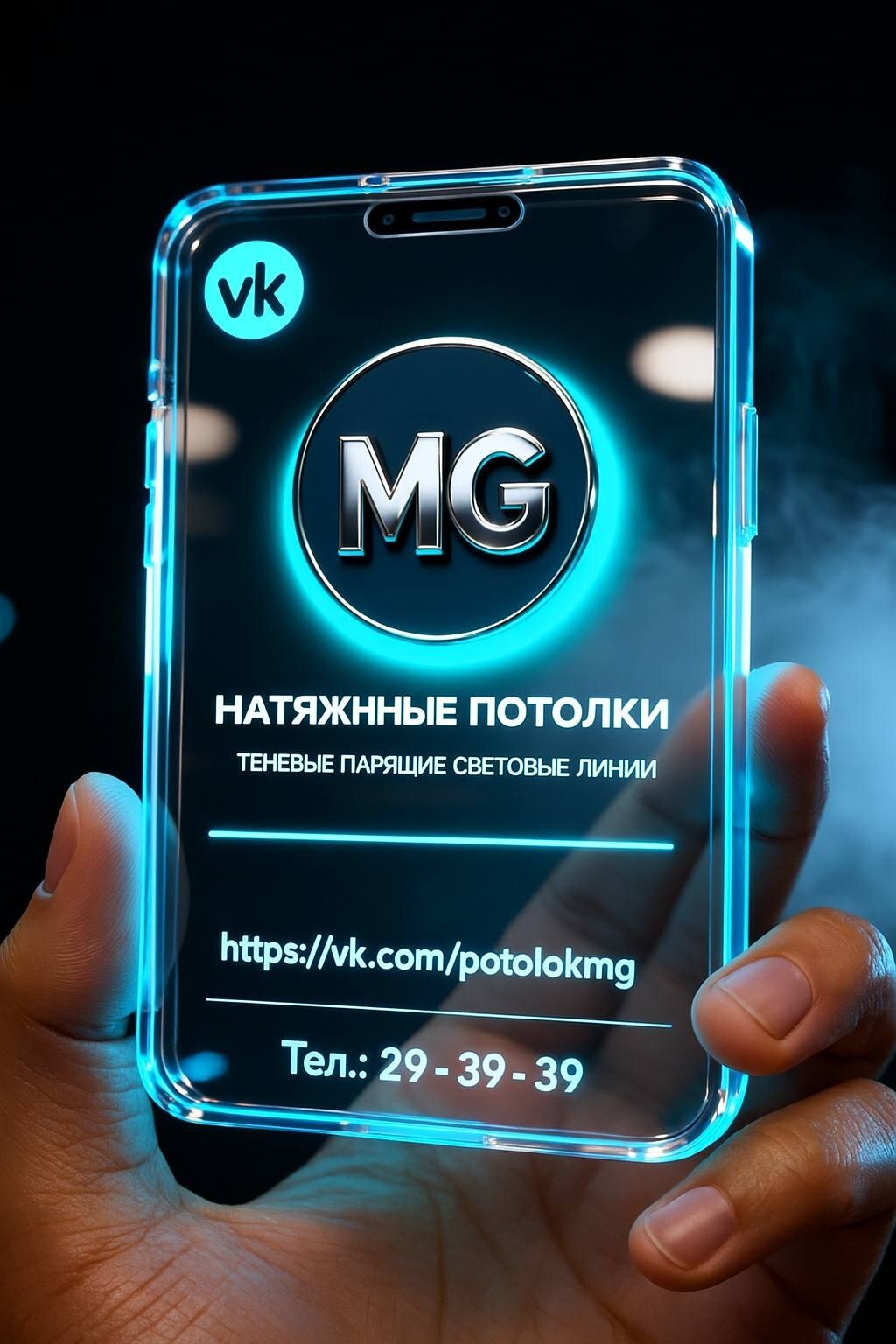 Фотореалистичный неоновый мокап визитки-профиля в руке. Крупный план человеческой мужской руки, удерживающей прозрачную акриловую карточку форм-фактора смартфона. Карточка полупрозрачная, с объёмной кромкой и ярким внутренним свечением холодного неона. Фон глубокий чёрный, мягкое боке. Главный цвет свечения - неоново-голубой. Высокая детализация пальцев и кожи, реалистичные блики и отражения на стекле.