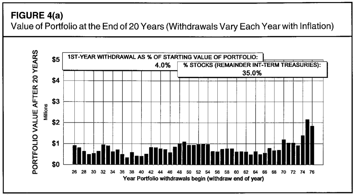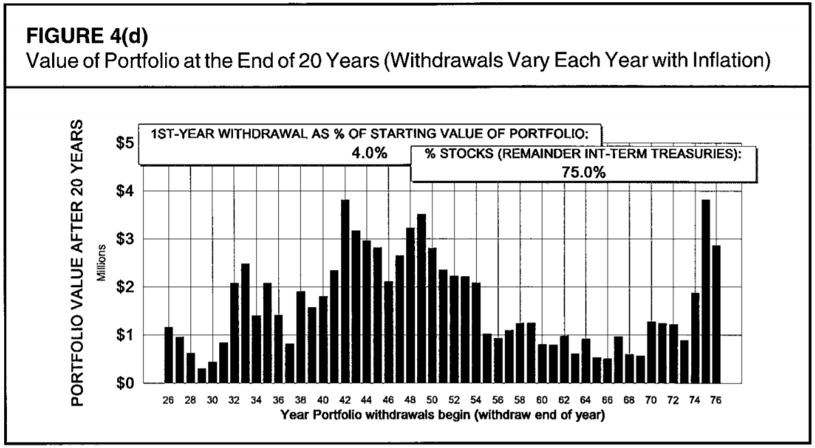 Бенген не считал дальше 50 лет, но многие периоды улетали в стратосферу. Это не так важно, и в век когда не было Экселя, это было роскошью в части временных затрат на расчеты. Вывод 3% от объема портфеля безопасен во все периоды, даже самые плохие, с 1926 по 1976 год.