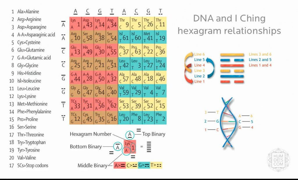 Таким образом, любая наследственная информация записана языком, содержащим лишь четыре буквы. Каждая из химических групп представляет аминокислоту и формирует так называемый кодон. В нашем генетическом коде 64 кодона, так же как и 64 гексаграммы в И-Цзин.