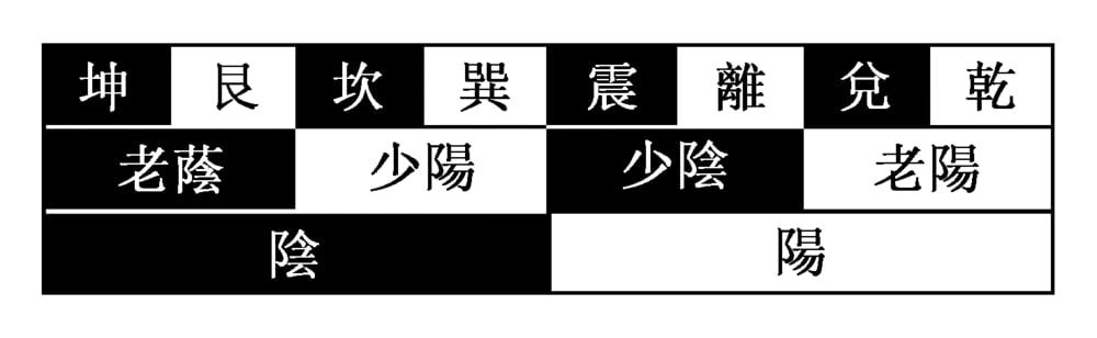 Изображая янские порождения Великого Предела в виде белых полей, а иньские — в виде черных полей, древовидное изображение можно представить в виде следующей схемы: