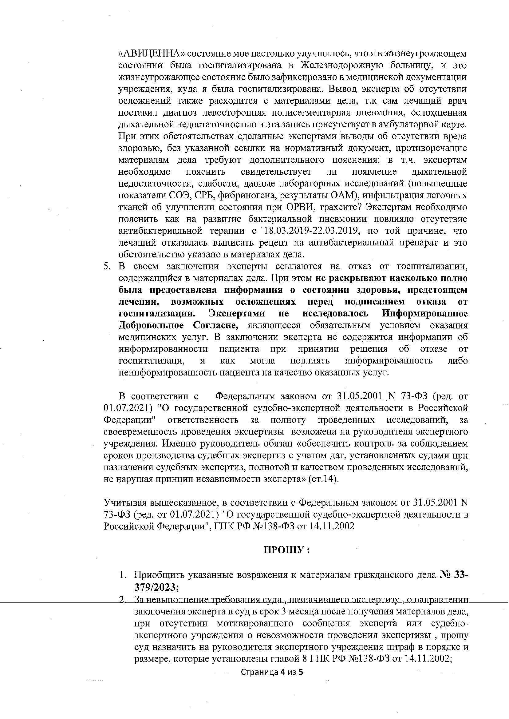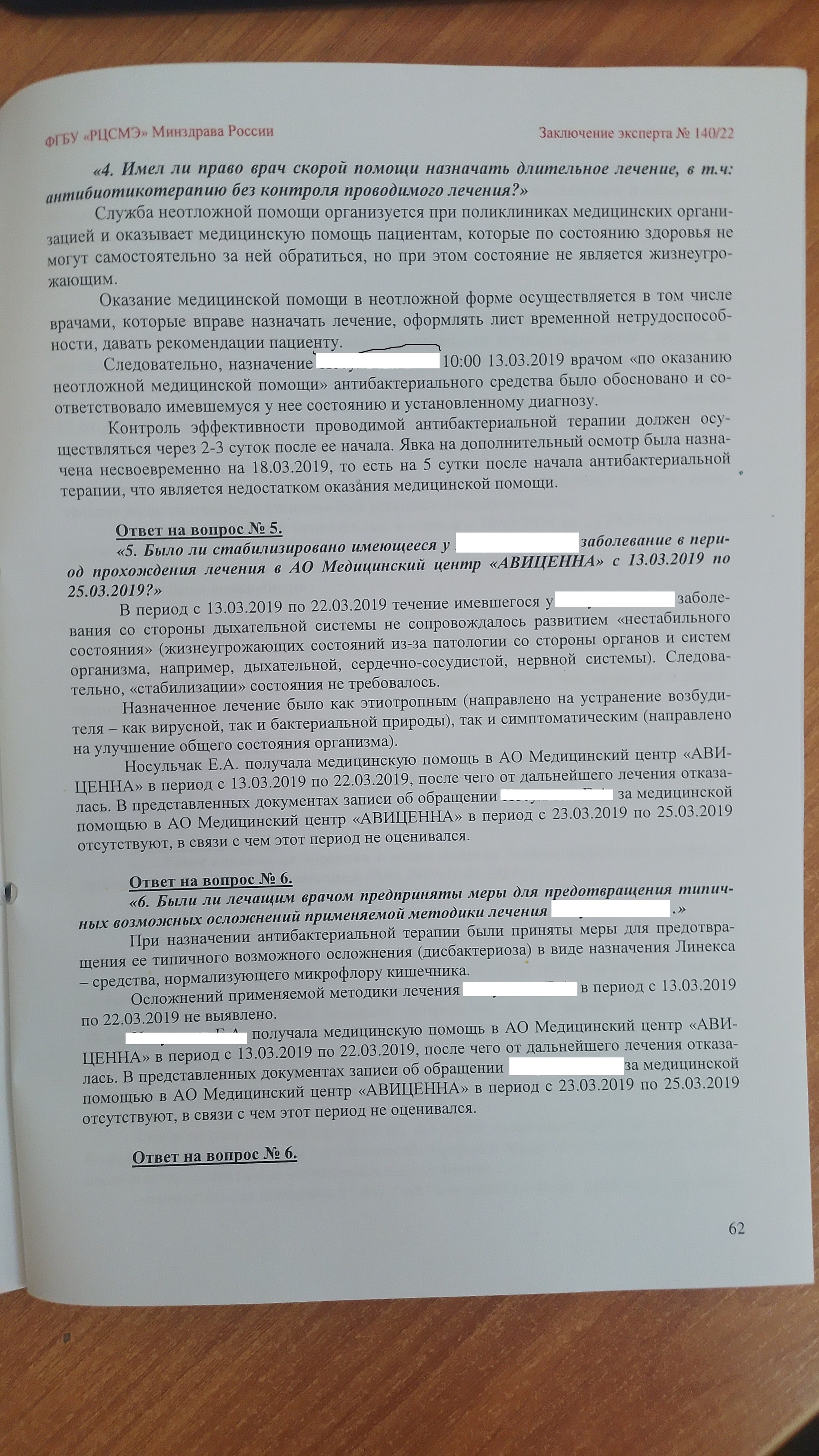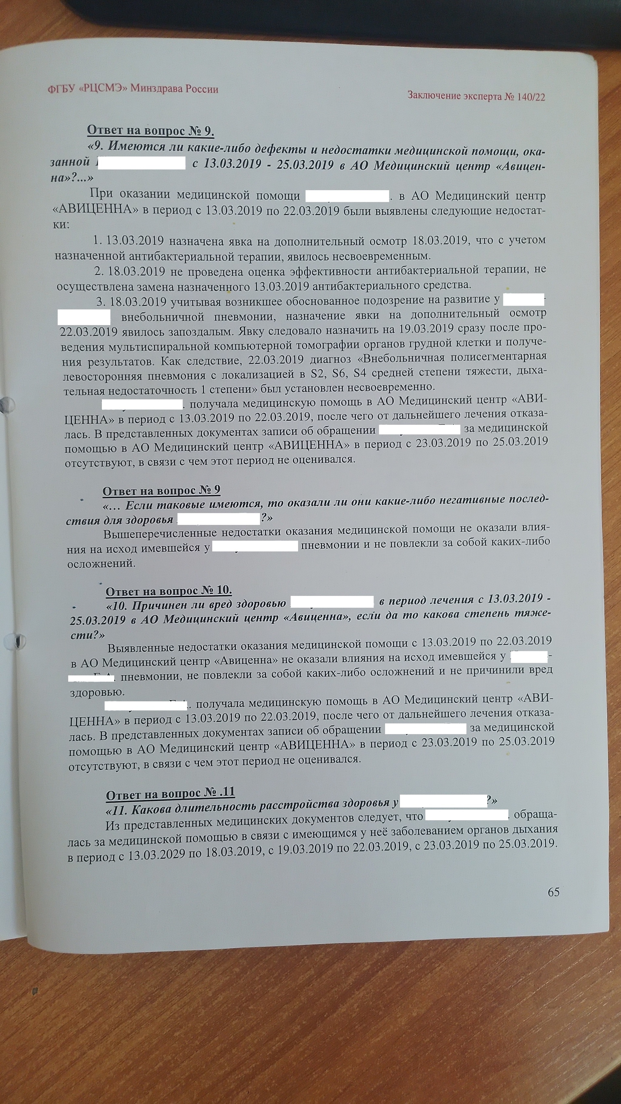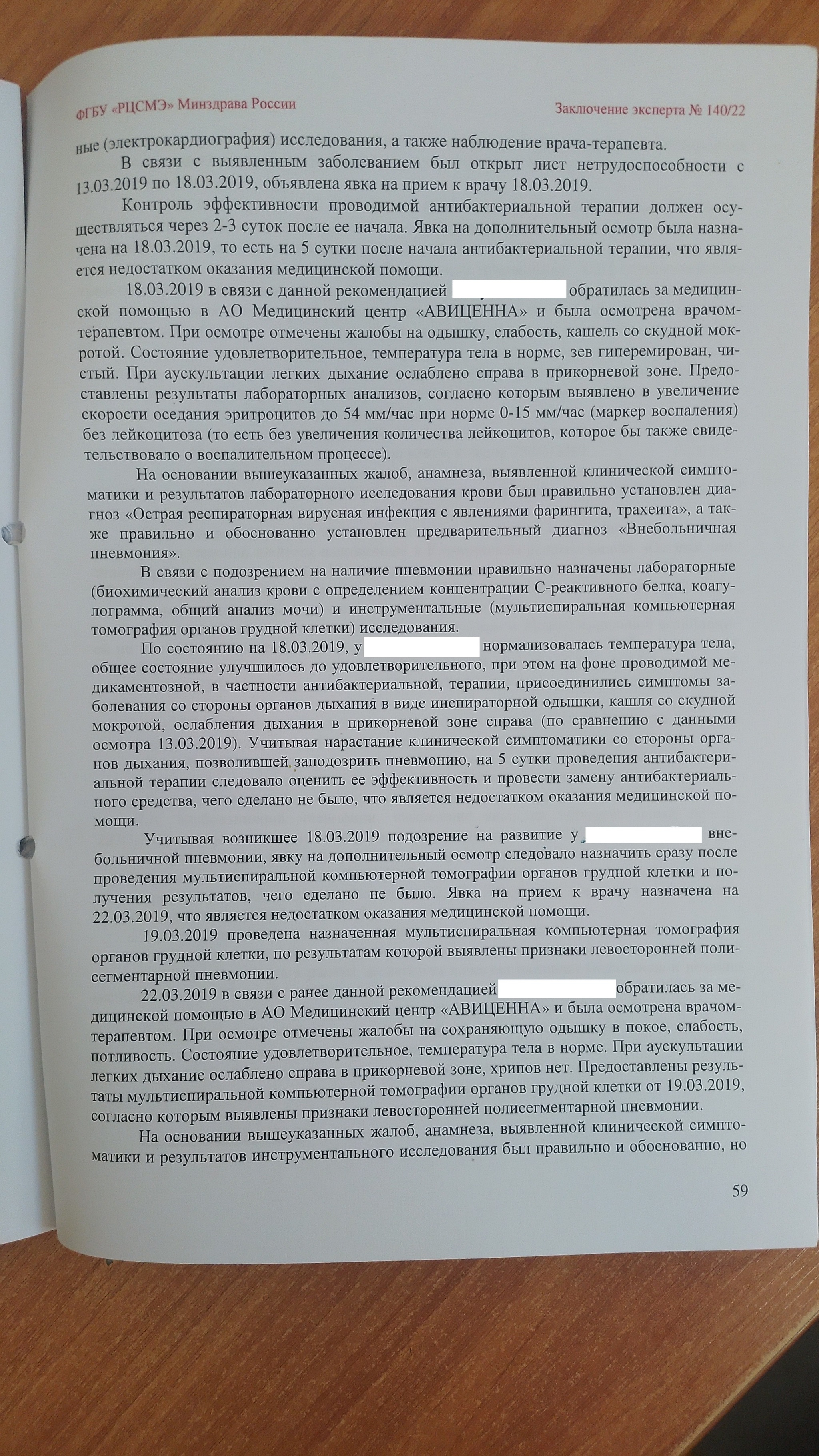 Напомню: я никак не отношусь к правоохранительной системе, к судебной системе. Я обыкновенный гражданин, имеющий право на защиту своих прав и мне хочется показать как работает у нас в стране эта система, которая создавалась для защиты наших прав. В прошлых моих постах указано : в 2019г. я заболела, находясь в длительной командировке в Новосибирске, и в связи с высокой температурой вызвала частную скорую помощь Медицинского центра АВИЦЕННА (ДМС позволял). Дальнейшее меня удивило: лечащий врач почему-то отказался мне выдать рецепт на антибиотик, ну не выдал, так не выдал, значит не так надо и можно не пить, но только состояние мое резко ухудшилось, о чем я и сообщила лечащему врачу, на что мне была предложена платная госпитализация, от которой я была вынуждена отказаться, т.к денег не было, о том, что можно бесплатно или по ДМС и нужно прямо сейчас мне врач не сказала и продолжила лечить меня амбулаторно, в результате через 3 дня я была экстренно госпитализирована с дыхательной недостаточностью и пневмонией в Железнодорожную больницу. Все закончилось для меня плохо: пневмофиброз, вновь выявленная неконтролируемая бронхиальная астма, пожизненное лечение. Росздравнадзор подтвердил, что при оказании помощи был нарушен 323-ФЗ, не соблюдены требования стандартов лечения. Мне сложно было даже просто принять, что теперь я ежемесячно должна биться за льготные лекарства, мне это было унизительно. И я решила бороться: за себя, за то, что нельзя творить дичь безнаказанно, нельзя безнаказанно зарабатывать на пациентах, затягивая сроки оказания помощи. И я обратилась в суд. Как указано в прошлых моих постах при рассмотрении дела в Железнодорожном районном суде г. Новосибирска было уничтожено доказательство, которое было предоставлено мною для исследования экспертами, копию суд отказался принять и вынес решение, полностью отказав в требованиях. Я подала апелляцию в Новосибирский областной суд, была назначена повторная экспертиза, суд запросил у меня вопросы для экспертов, экспертное учреждение было выбрано по ходатайству ответчика это РЦСМЭ г. Москва. И все, почти два года проводилась экспертиза, от суда мне предоставляли информацию, что оказывается первый год я просто была в очереди, и только во второй год к ней приступили, но всех еще не собрали и т.д. Наконец, 04.04.2023 из суда сообщили, что пришло заключение эксперта, ознакомиться с ним было очень проблематично: первое наше ходатайство об ознакомлении кануло в недрах суда, мы написали второе и обратились через председателя суда. 13.04 мы смогли ознакомиться и 18.04.23 было судебное заседание, мои требования удовлетворены частично, была в полном объеме возвращена стоимость повторной экспертизы, однако с выводами суда об отсутствии признаков вреда здоровью я не согласна. Я хочу представить вам это самое заключение, которое стало основой определения апелляционной коллегии судей под председательством судьи Недоступ Т. В. Сразу скажу, что даже определение суда, на основании которого проводилась экспертиза вдруг стало не 2021г (то определение, которое было направлено мне в 2021г), а 2022г. У меня сразу возник вопрос, на который мне так никто и не ответил: либо было еще одно заседание суда, о котором меня не извещали в 2022г, либо основанием для проведения данной экспертизы было не то определение и не того суда, экспер