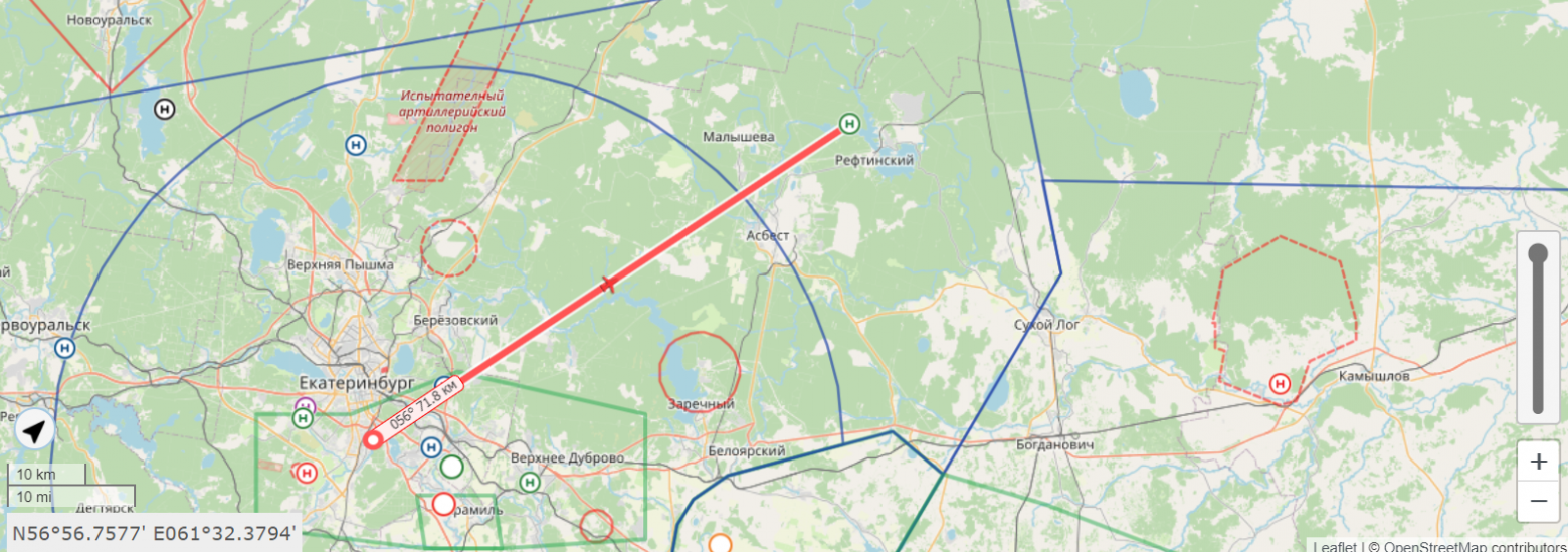 Маршрут не должен проходить через различные ограниченные или запрещенные зоны: территории аэропортов и диспетчерских зон, вертолетных площадок, военных полигонов и т.п. Их актуальное расположение можно посмотреть здесь.