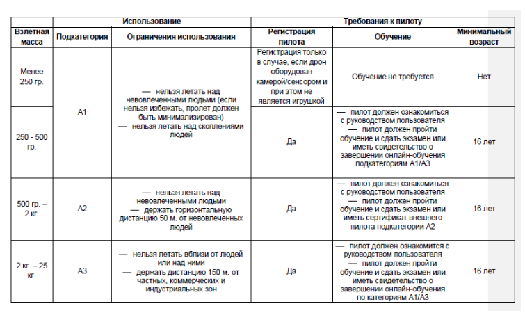 Итак, на сайте Агентства авиационной безопасности ЕС (EASA) можно найти достаточно информативную табличку о том, что можно, а что нельзя в зависимости от весовой категории дрона. Вот ее перевод на русский: