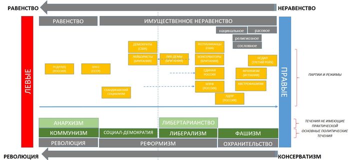 (а) левые либералы, правые либералы... положение либерализма в этих политических координатах совершенно не ясно. Получается, либерализм может быть кардинально противоположен самому себе. Но при таком положении дел это течение раскололось бы, как когда-то отделились друг от друга социал-демократия и коммунизм. Либерализм — правая идеология, хотя бы потому что является доминирующей в современном мире, она никак не может быть левой.
