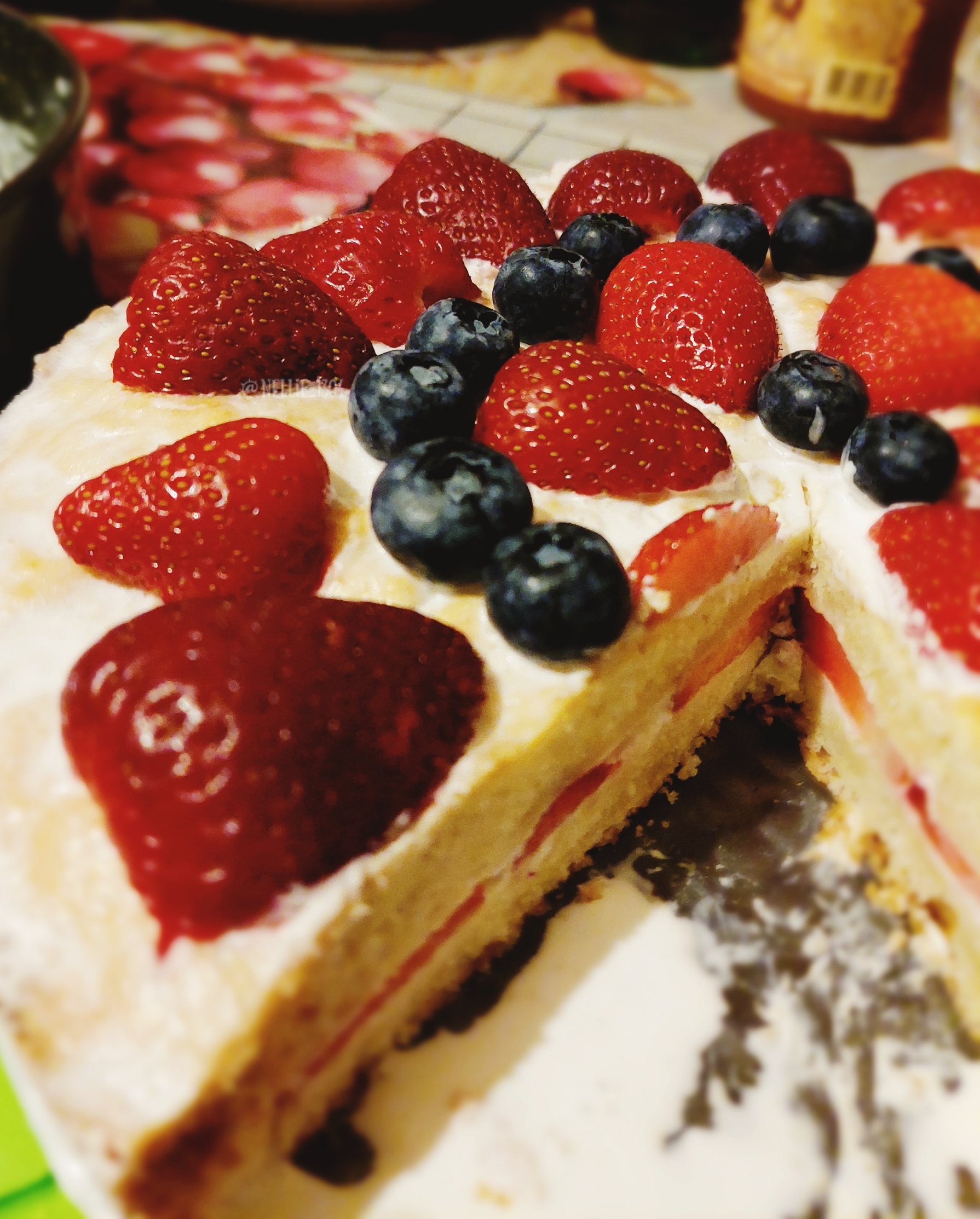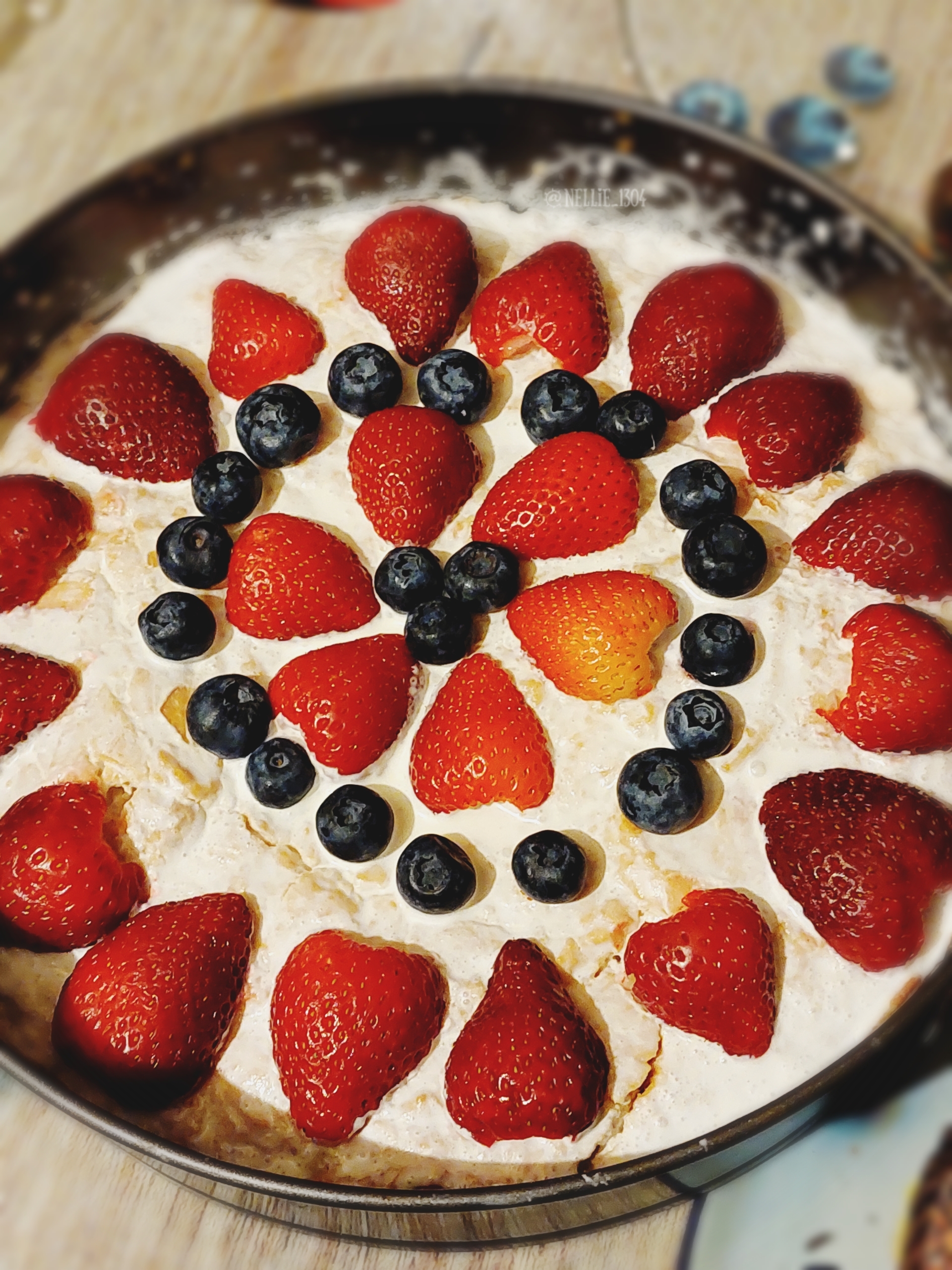 Затем накрыла вторым коржом и повторила процедуру, только клубничку уже разложила красиво и добавила голубики