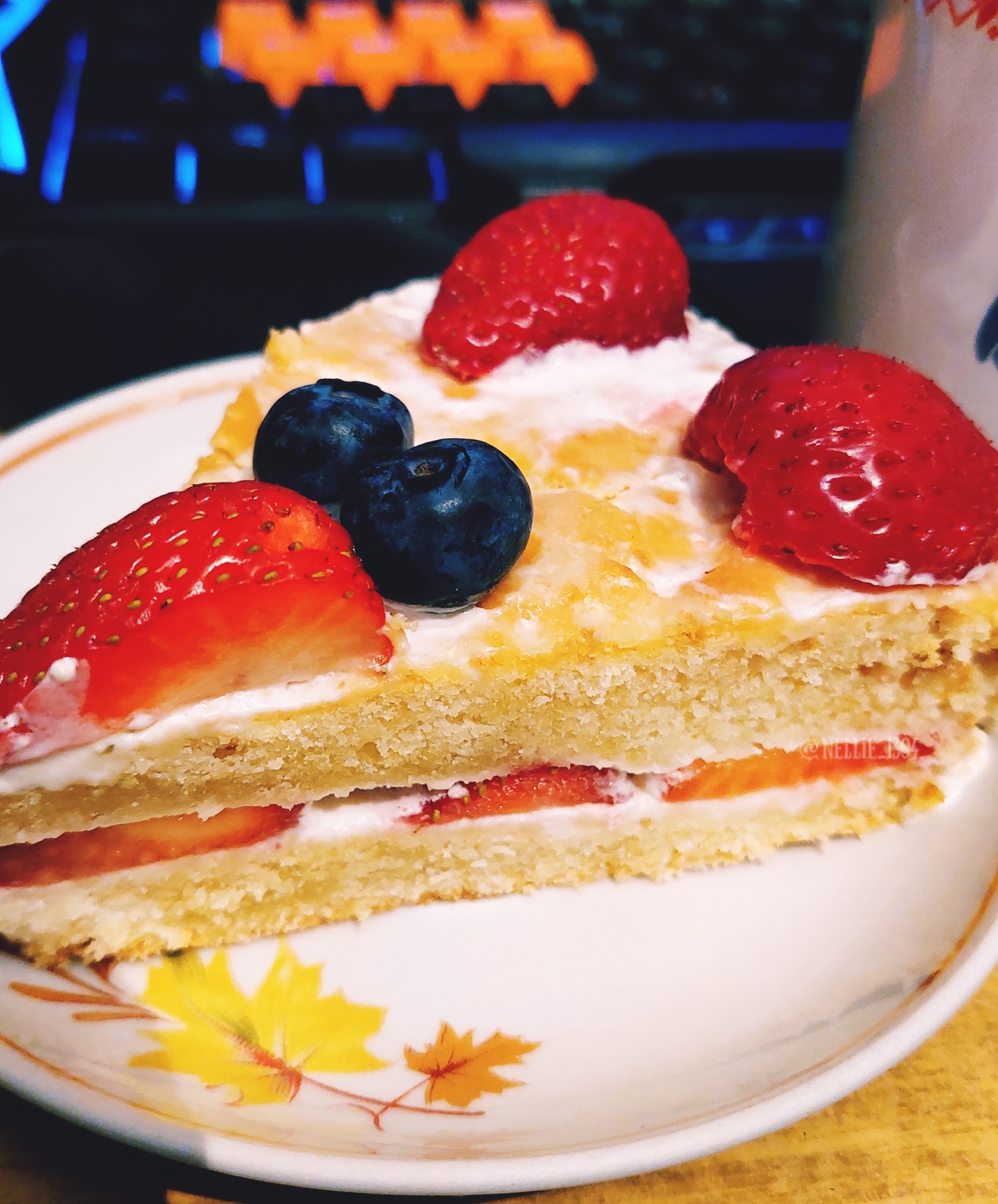 Разделила корж на два. Первый оставила на дне формы в которой он пёкся, намазала "кремом" из сливок и полностью покрыла дольками клубники так, что не осталось свободного места. Сверху ещё раз залила взбитыми сливками.