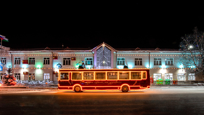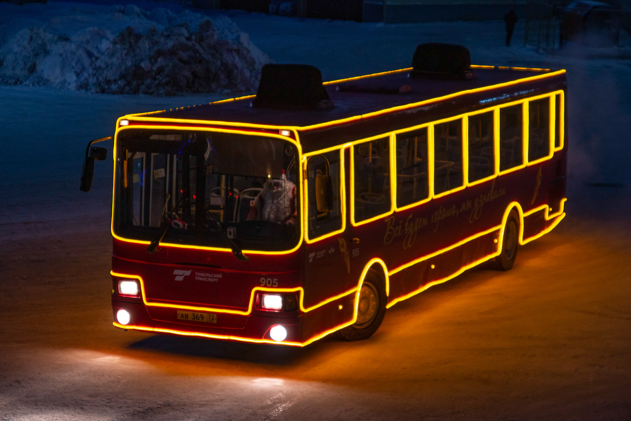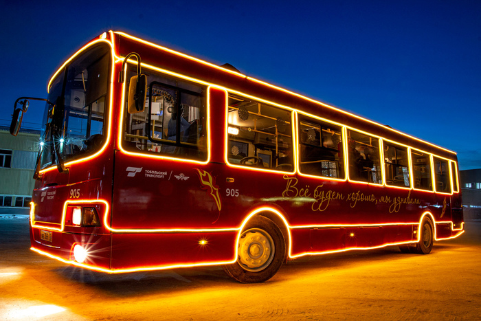 Тобольское ПАТП второй год подряд под новый год выпускает на линию праздничный автобус. На крыше установлены две больших колонки которые транслируют праздничные песни и поздравления.