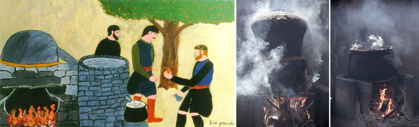 А на Крите вокруг котла с раки идет гуляние: друзья производителя раки и хозяина котла собираются, чтобы попробовать свежий раки и закуски к нему (ракомезедес), которые запекают на углях от котла.