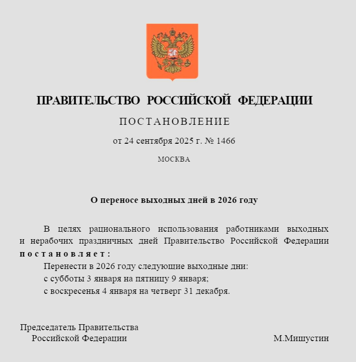 Председатель Правительства Михаил Мишустин подписал постановление о переносе выходных дней в 2026 году.