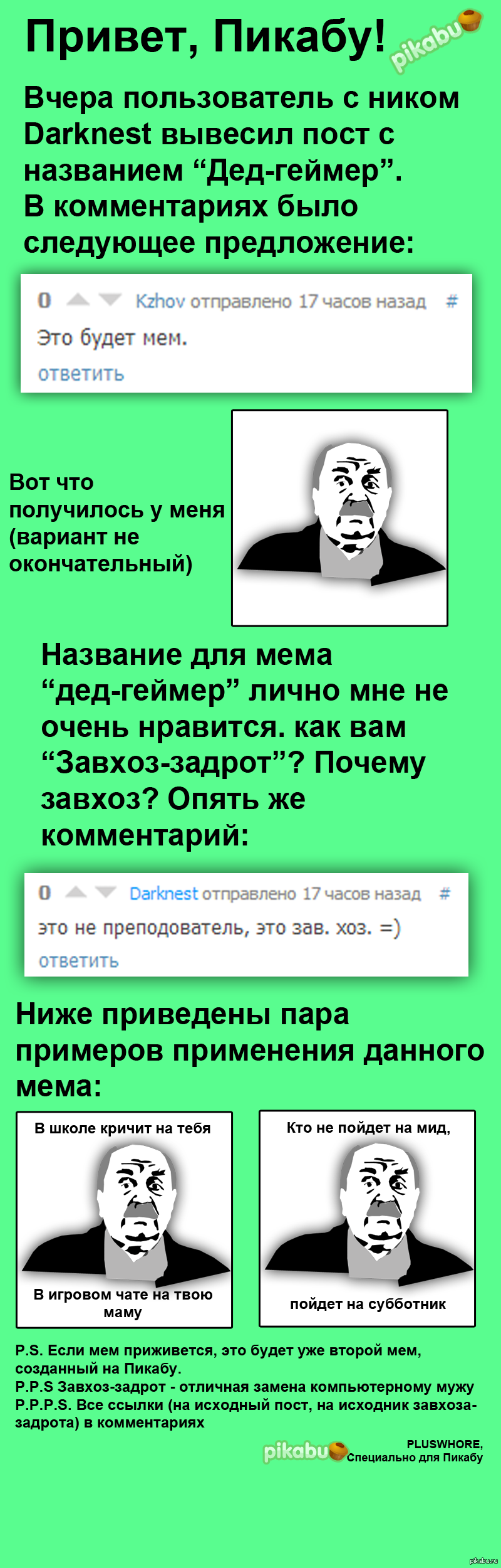 17 PLUSWHORE 12 лет назад Предлагаю ввести новый мем! Завхоз-задрот - российская альтернатива "компьютерному мужу". Все ссылки в комментариях [моё] Мемы Задроты Завхоз