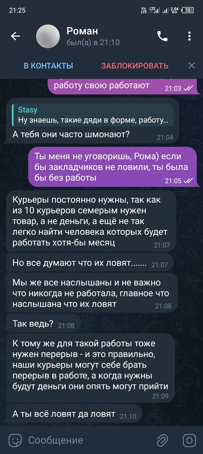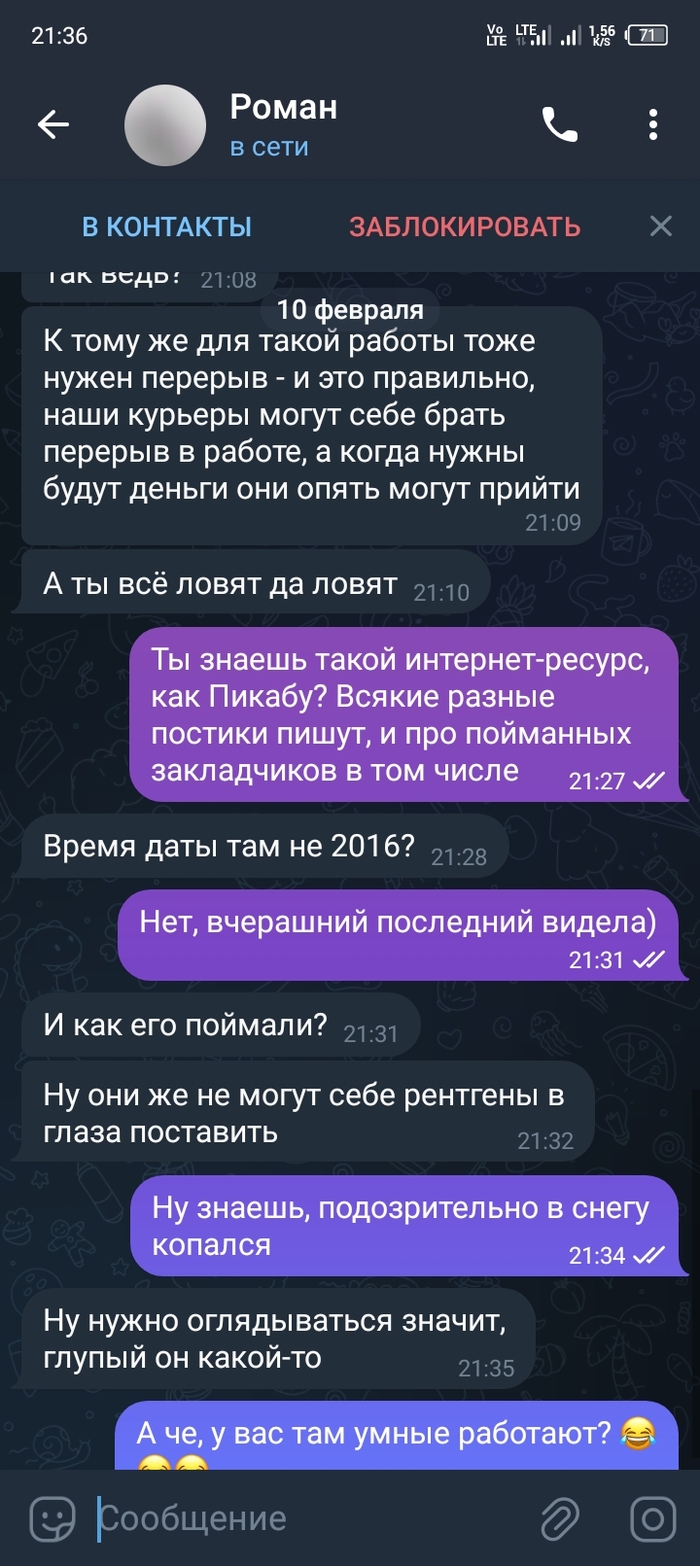 9235 Небезопасный контент (18+) Авторизуйтесь или зарегистрируйтесь для просмотра Alic25e Юмор Предложение о работе2 1 год назад Сижу, работу на работе работаю, а тут такое вот) [моё] Скриншот Диалог Наркотики Закладчики Идиотизм Юмор Троллинг Длиннопост Переписка 166 123 14 13 8 Ещё 0