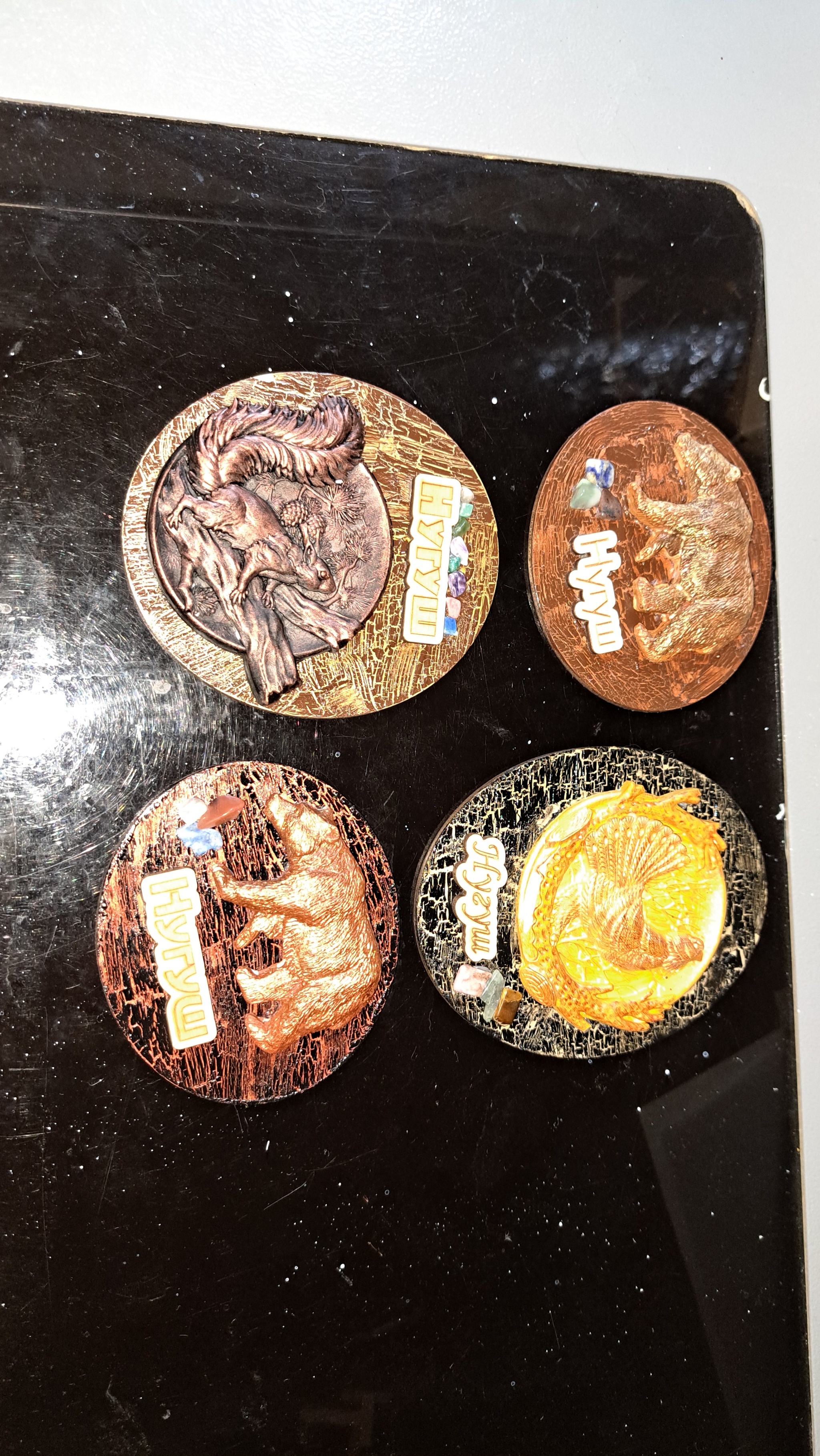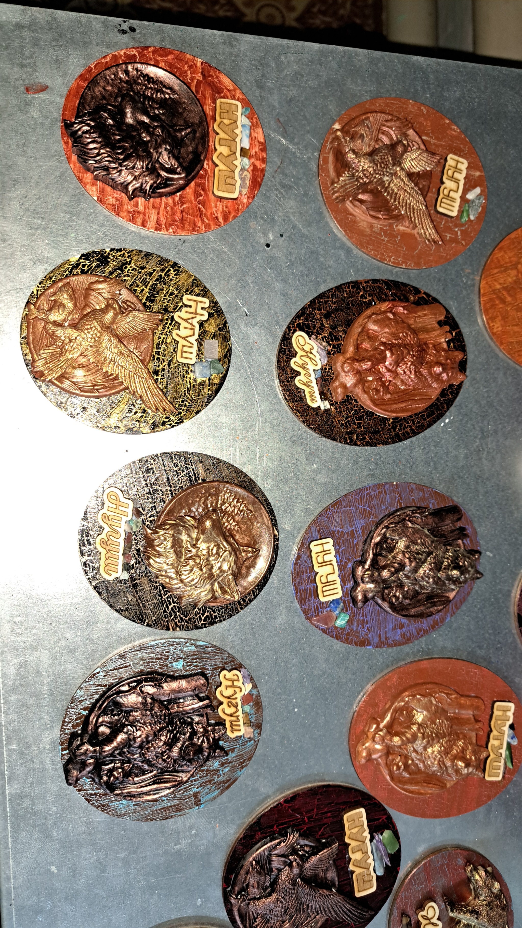 Если не знать что это фанера, то и догадаться сложно (если только не перевернуть). Основание окрашено акриловыми красками в два слоя, с промежуточным слоем кракелюрного лака. Потому что фанера смотрится дешево и снижает цену керамики, а так смотрится намного лучше. Пытался делать на поперечных спилах дерева, да не смог найти спилы по нормальным ценам.