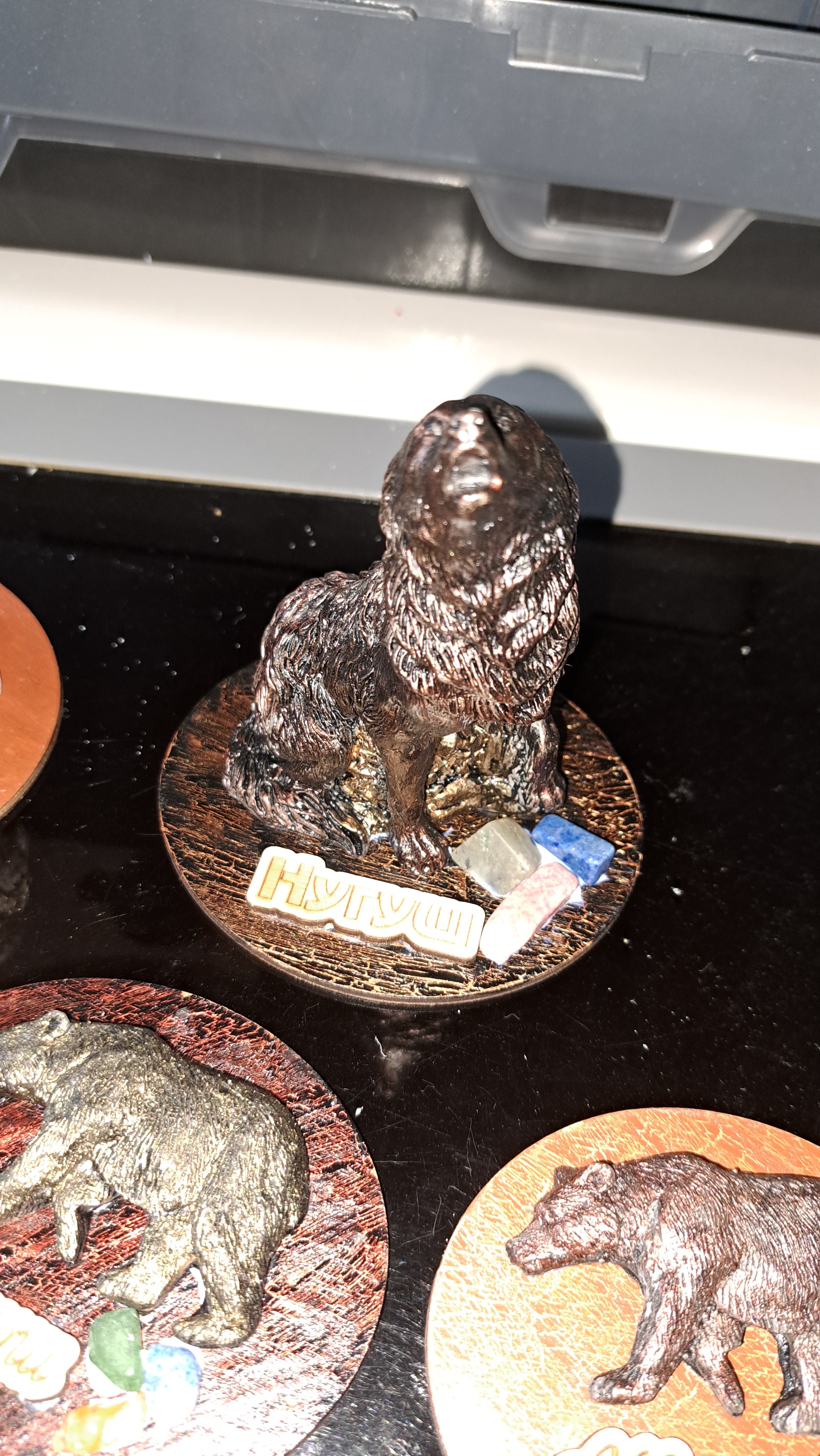 Вот в итоге к чему я пришел, тут основание из фанеры и "шильдик" тоже. Иногда просят лазерную гравировку на деревянных брелоках сделать.
