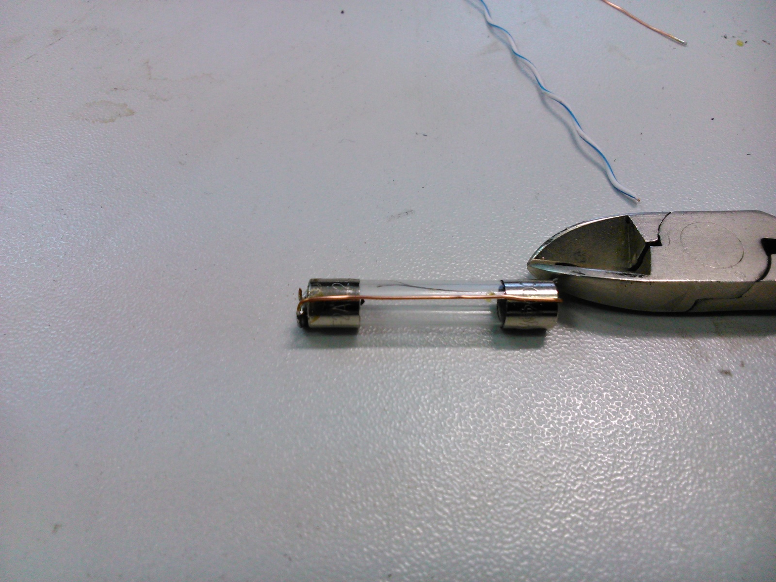 А вот это предохранитель из зарядника, который сгорел, как только я воткнул лампу, что не удивительно, ибо в прошлой жизни это был зарядник от фотика, и на такую нагрузку он не рассчитан.