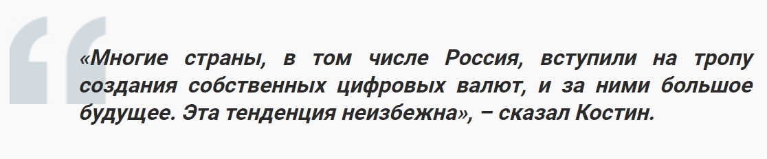 Костин высоко оценил опыт китайских властей в отношении цифровой валюты. Учитывая, что современный мир становится все более цифровым, рано или поздно все центральные банки запустят государственные цифровые валюты, добавил председатель правления ВТБ.