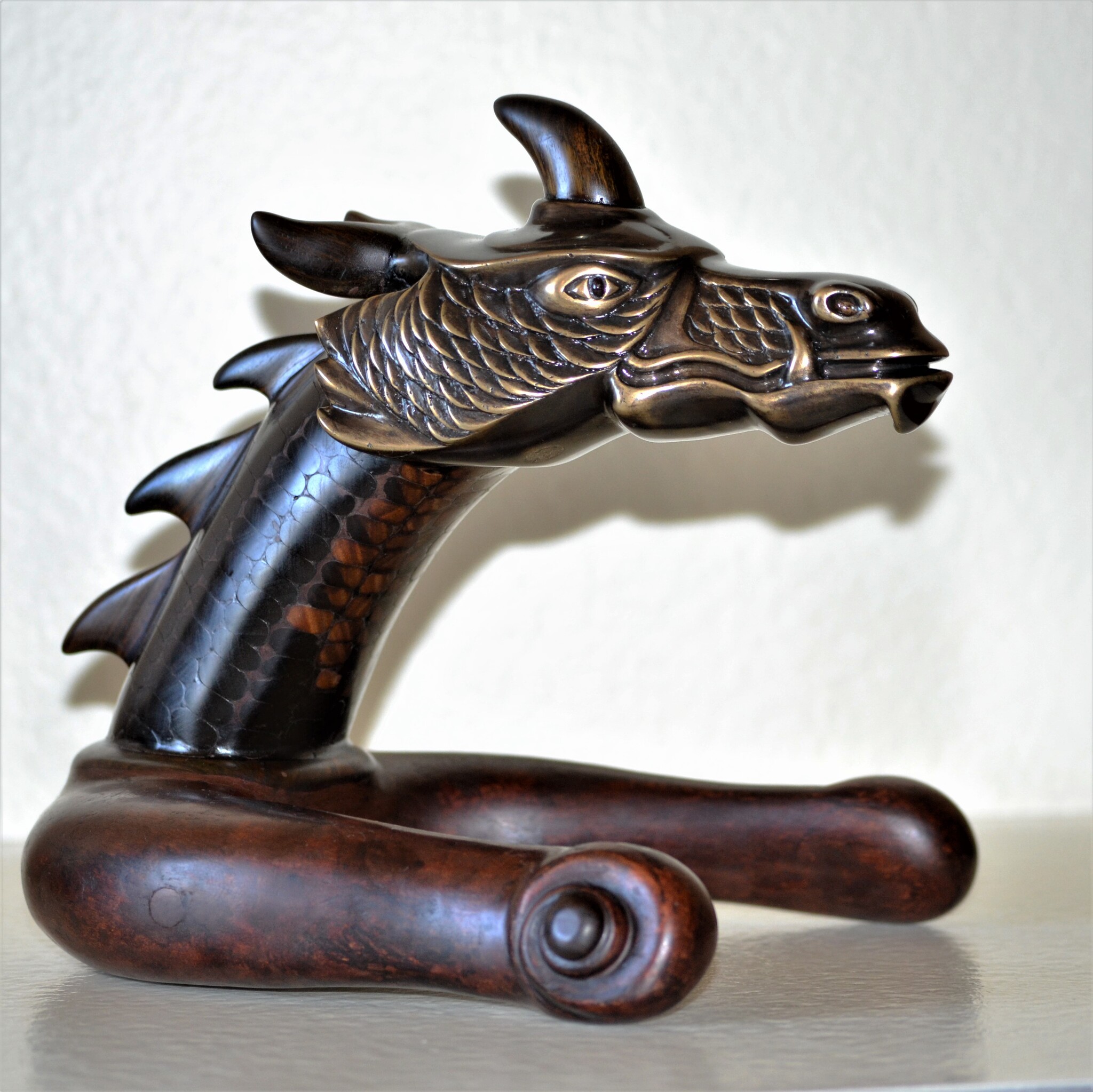 Материалы и технологии: Голова отлита из латуни на заводе по сделанным мною эскизам и модели, проведены очистка от пригара и слесарная обработка, травление кислотой. Зрачки из поделочных рубинов. Шея и подставка из корней неизвестного дерева. Рог, шипы, гребень, рисунок на шее - из бакаута. Дерево обработано бейцем и жидким парафином. Инструменты: резцы по дереву, микрофрезы, штихели, абразивные материалы. Крепёж: ПВА, специальный цемент, шурупы. Время работы: 5 лет. Размеры: 18 х 21 х 19см.