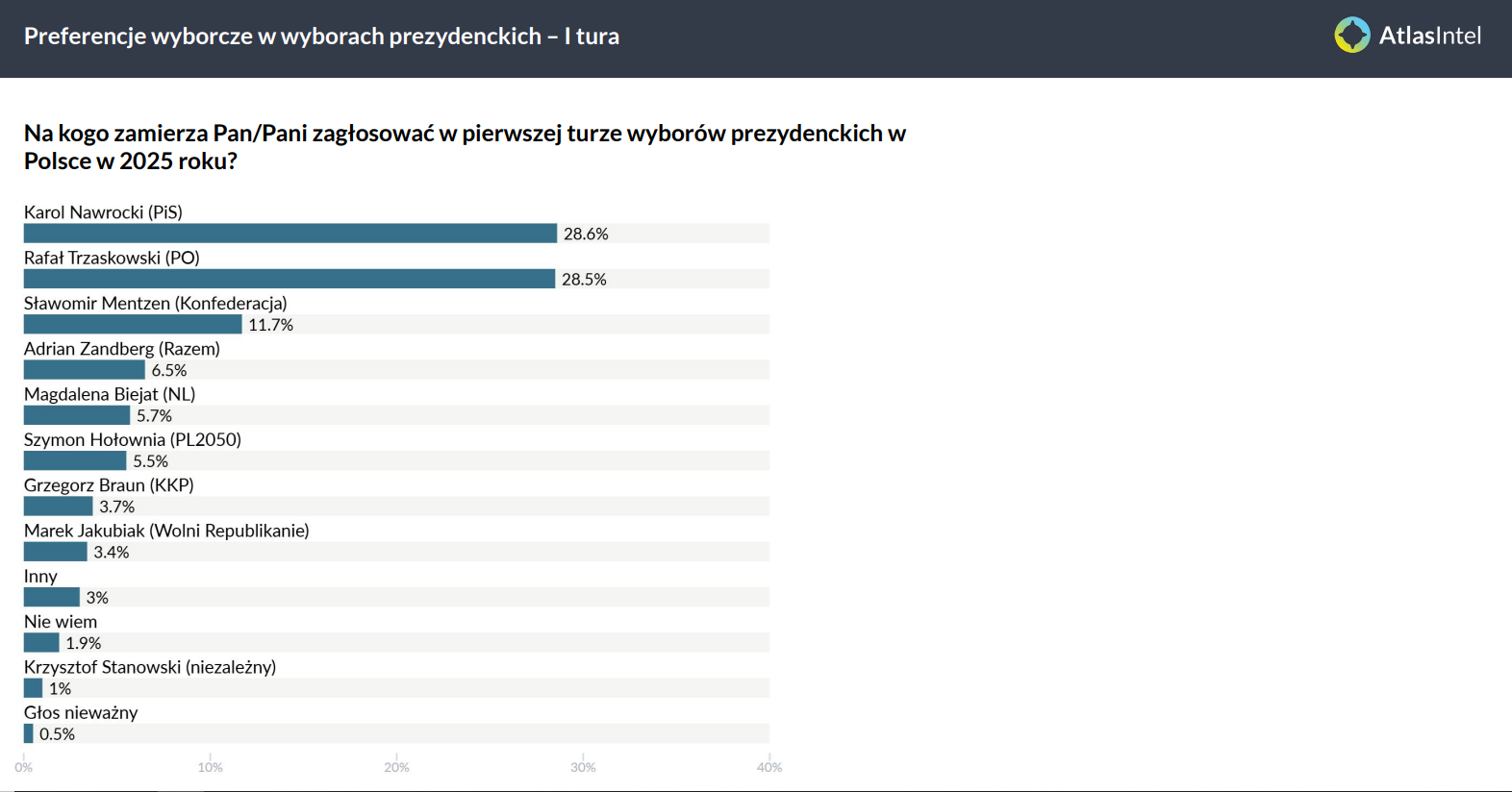Согласно последнему опросу Atlas Intel в первом туре президентских выборов Кароль Навроцкий и Рафал Тшасковский получат почти одинаковый уровень поддержки: Навроцкий — 28,6 %, а Тшасковский — 28,5 %. Этот результат можно рассматривать как статистическую ничью, которая находится в пределах допустимой погрешности. Во втором туре получается незначительное преимущество Навроцкого — 47 % по сравнению с 45,7 % у Тшасковского.