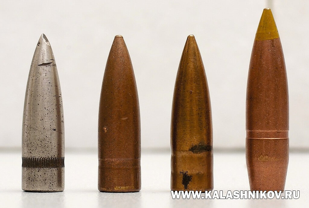 Слева направо. Пуля «Д» обр. 1930 г. (имеет задний конус и незакатанную кромку оболочки для улучшения условий обтекания воздушным потоком), пуля «Л» обр. 1908/30 гг. и 7,92-мм лёгкая немецкая винтовочная пуля