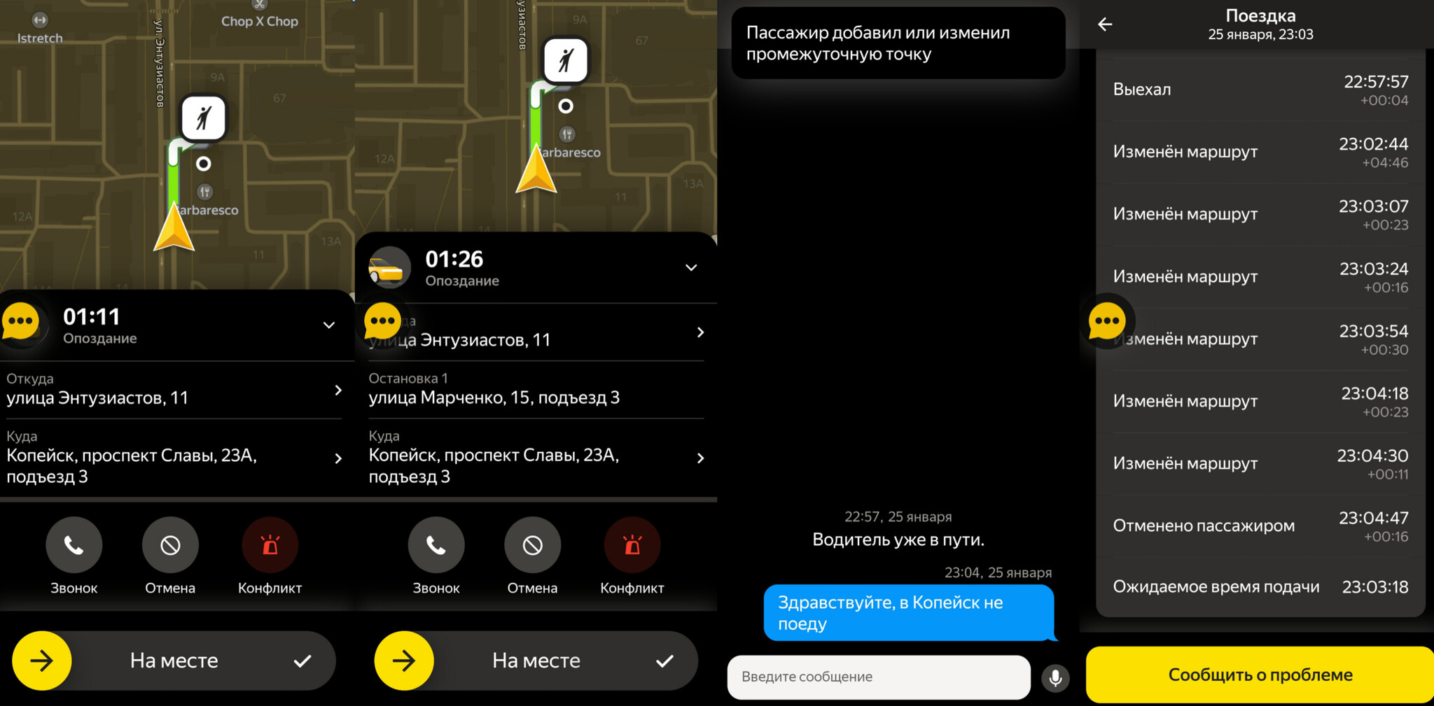 Изначально заказ был до Марченко. Не доехав до адреса подачи в карточке заказа началась карусель из конечных адресов. По итогу маршрут стал заканчиваться далеко за пределами "Моего района", о чём и сообщил пассажиру в чате. Отменили самостоятельно. На что они рассчитывали..?