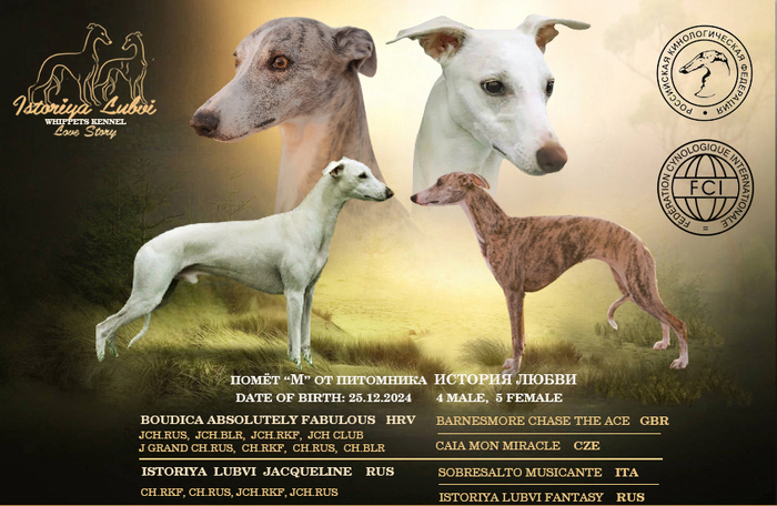 В известном питомнике "История Любви" 25.12.2024 родились щенки породы Уиппет - малая английская борзая.